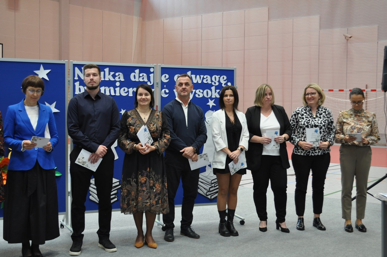 Uroczystość rozpoczęła się występem szkolnej grupy tanecznej, której energia i radość udzieliły się wszystkim zgromadzonym. Następnie na scenie pojawił się chór szkolny, zachwycając publiczność pięknym, pełnym emocji wykonaniem utworów muzycznych. Występ chóru wprowadził atmosferę wzruszenia i refleksji nad niezwykłą rolą nauczycieli w życiu każdego ucznia.