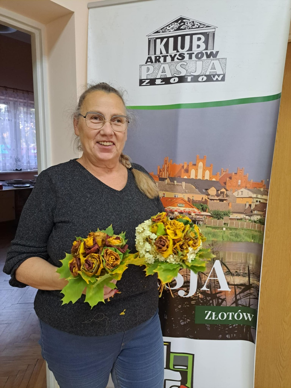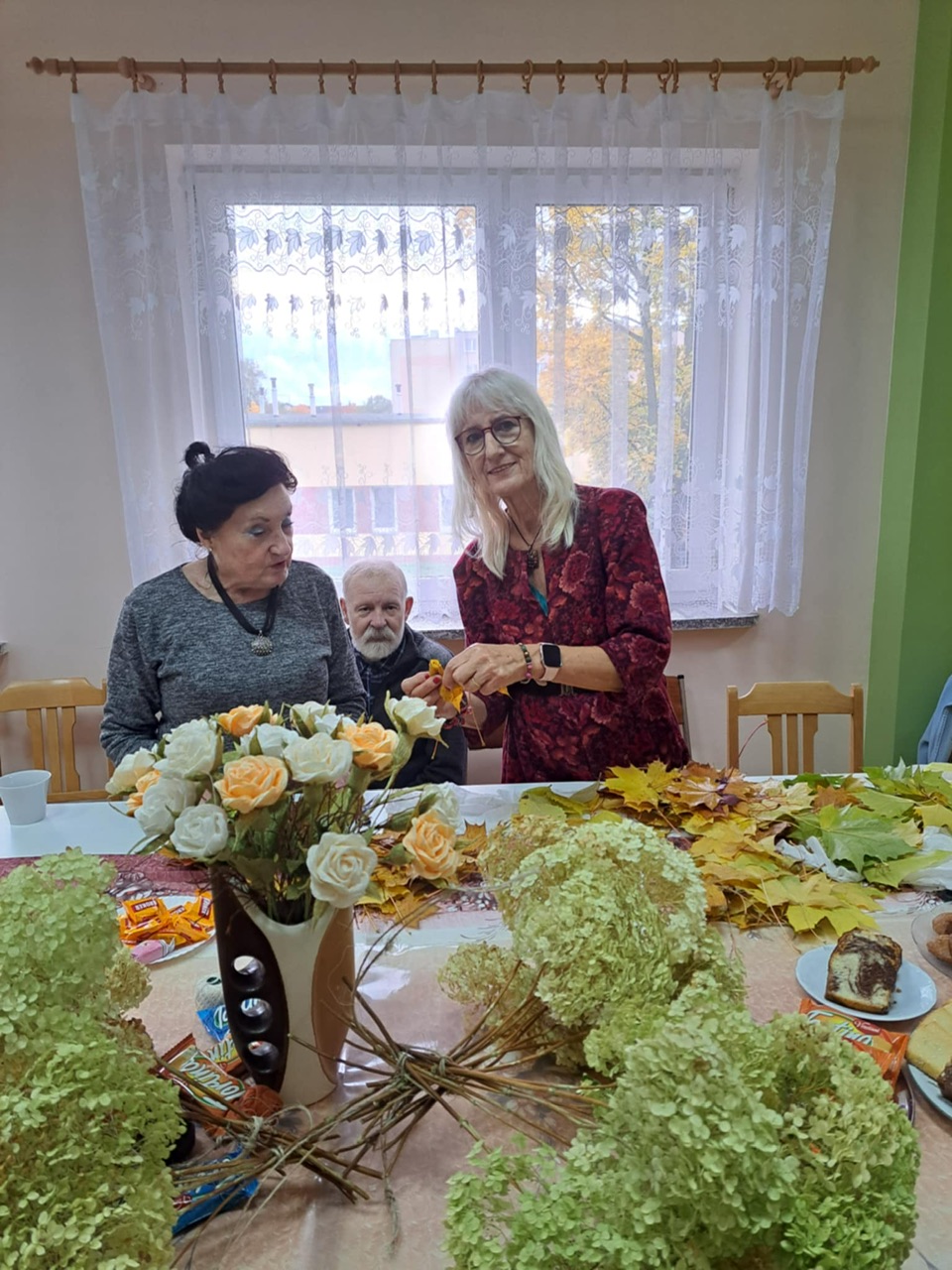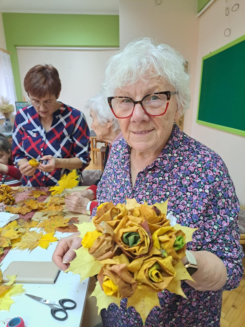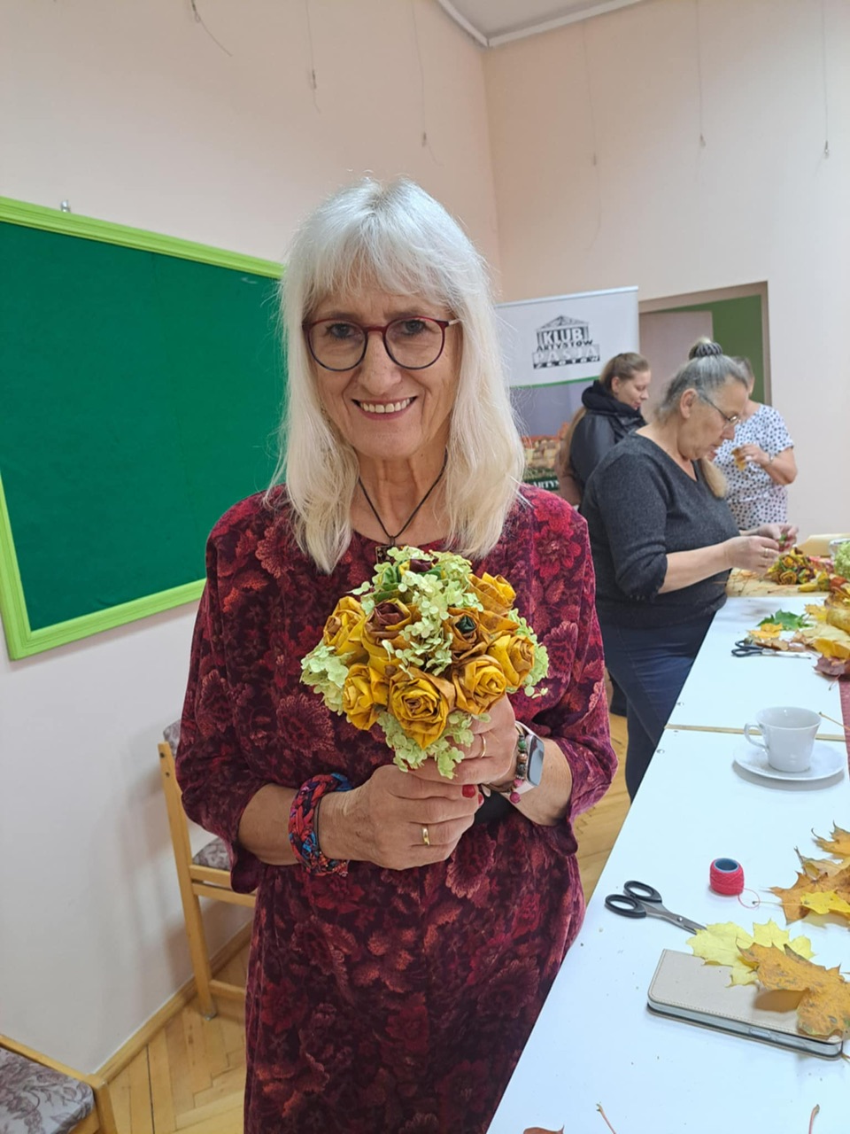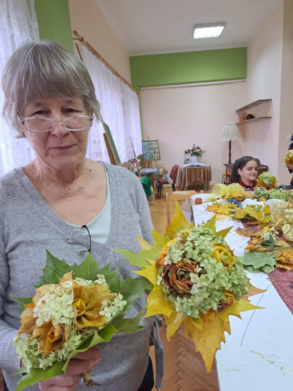 Każdy z uczestników przyniósł ze sobą pełne kosze kolorowych liści, z których powstawały niezwykłe róże i kompozycje florystyczne. W bukietach znalazły się między innymi liście klonu, platanu, dębu i orzecha, a także kwiaty hortensji, które dodały całości uroku i delikatności.