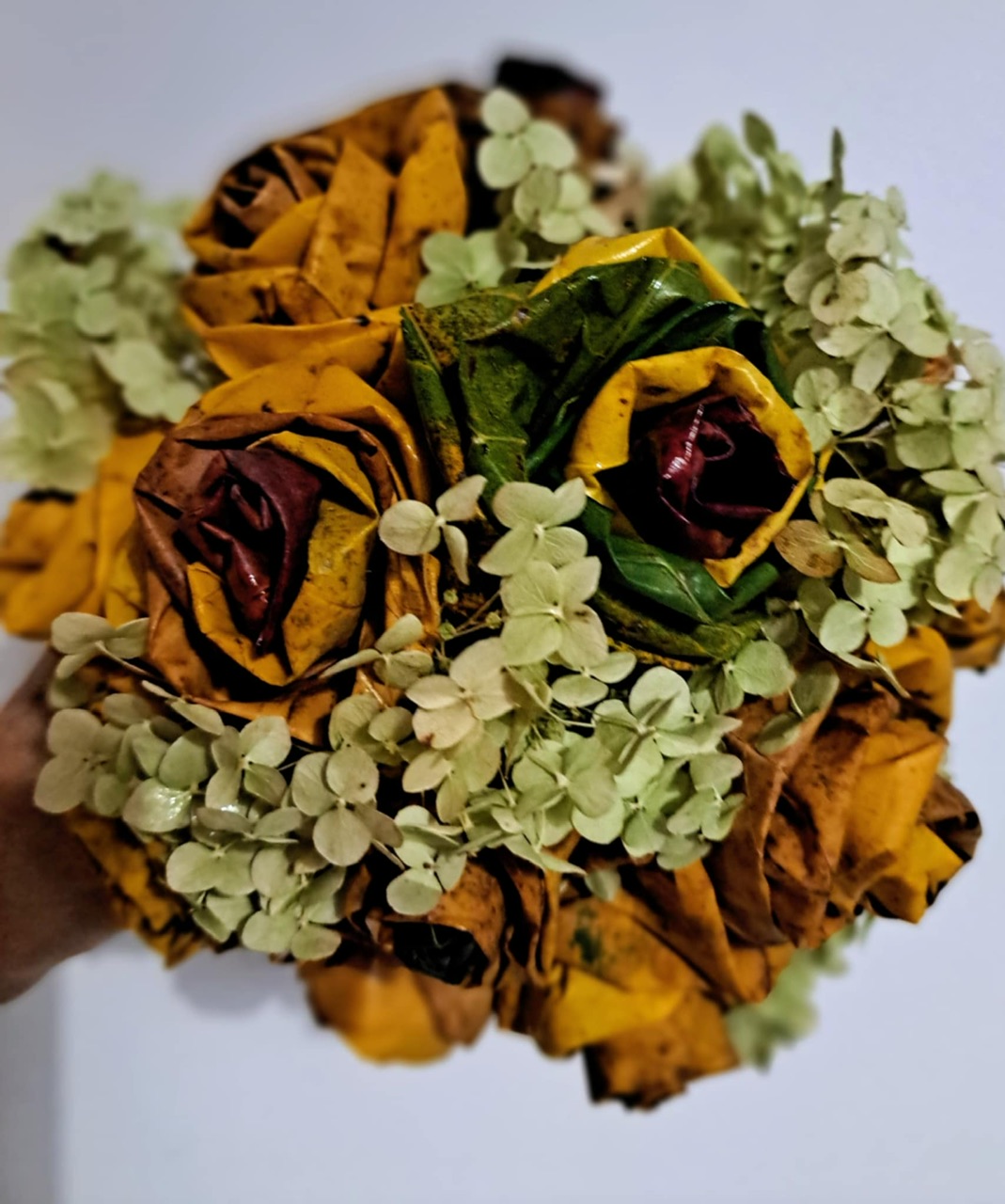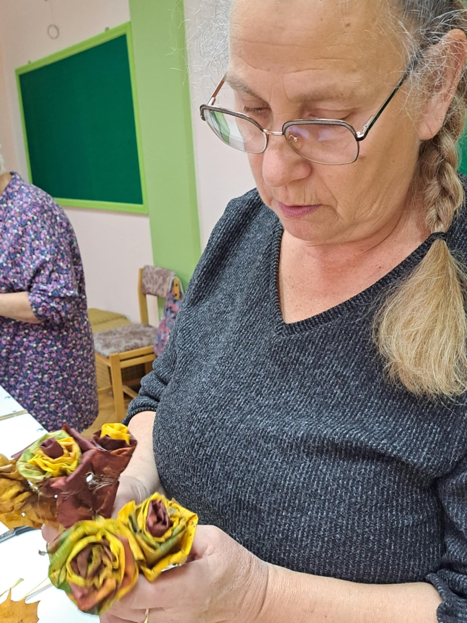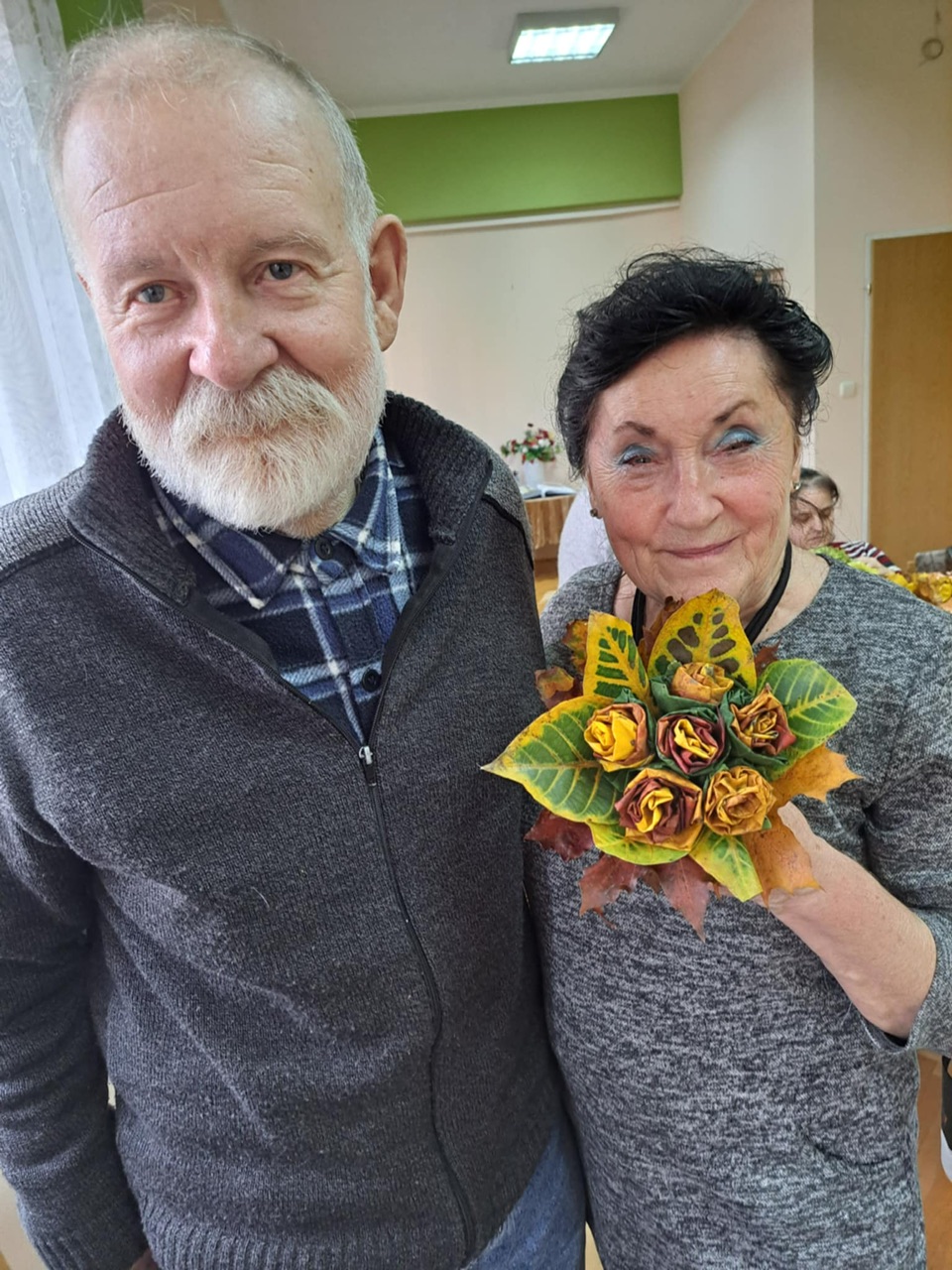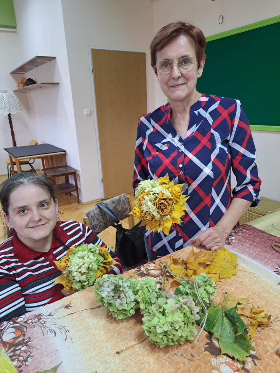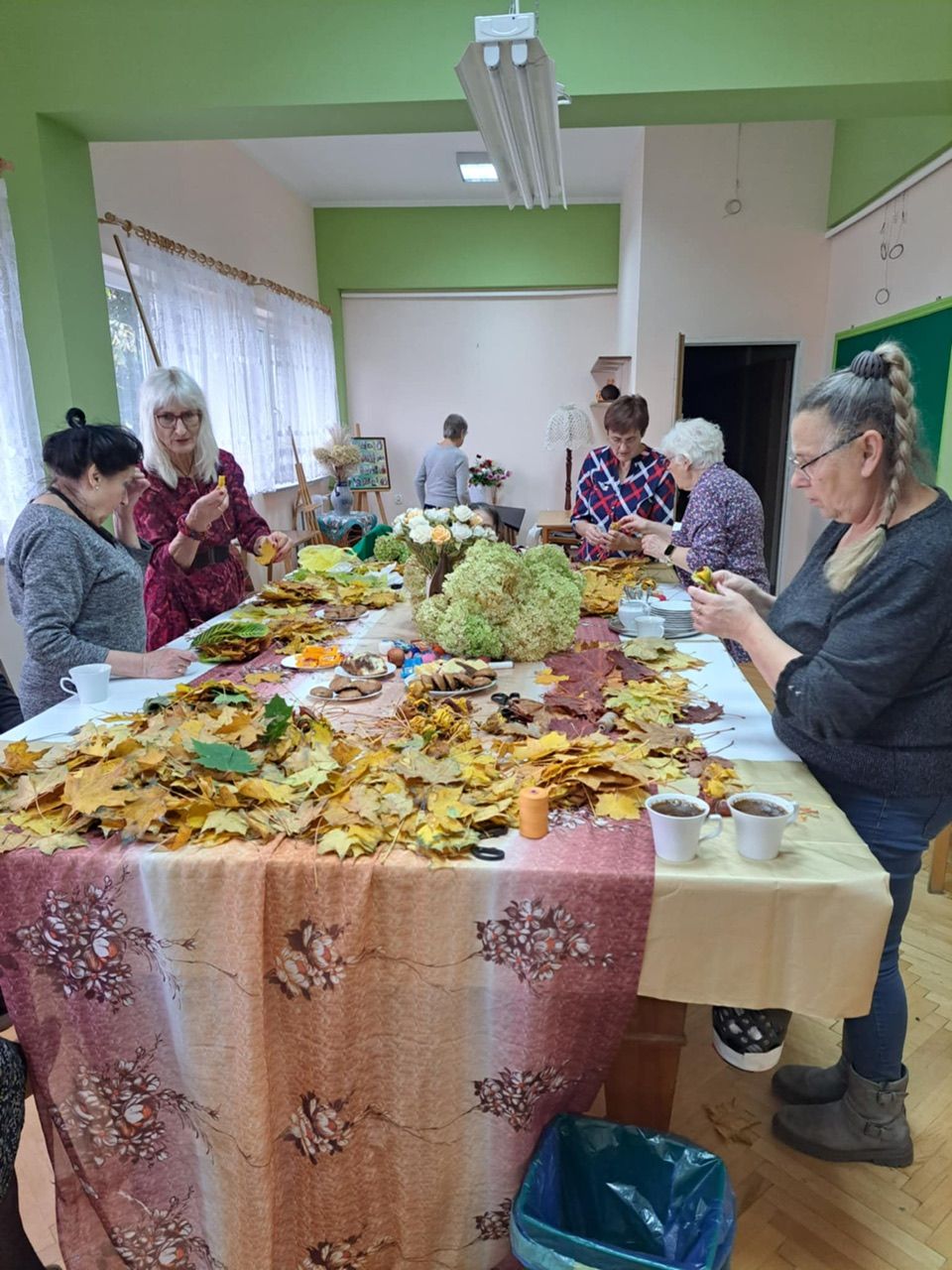 Każdy z uczestników przyniósł ze sobą pełne kosze kolorowych liści, z których powstawały niezwykłe róże i kompozycje florystyczne. W bukietach znalazły się między innymi liście klonu, platanu, dębu i orzecha, a także kwiaty hortensji, które dodały całości uroku i delikatności.