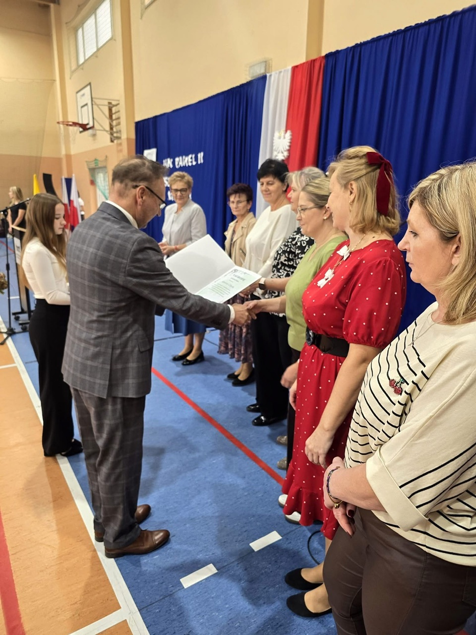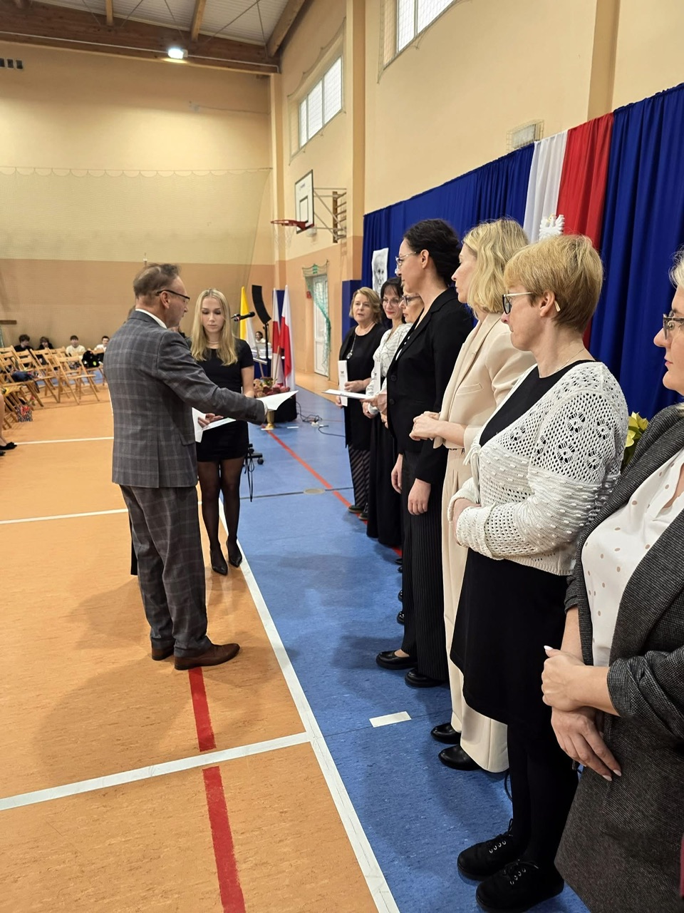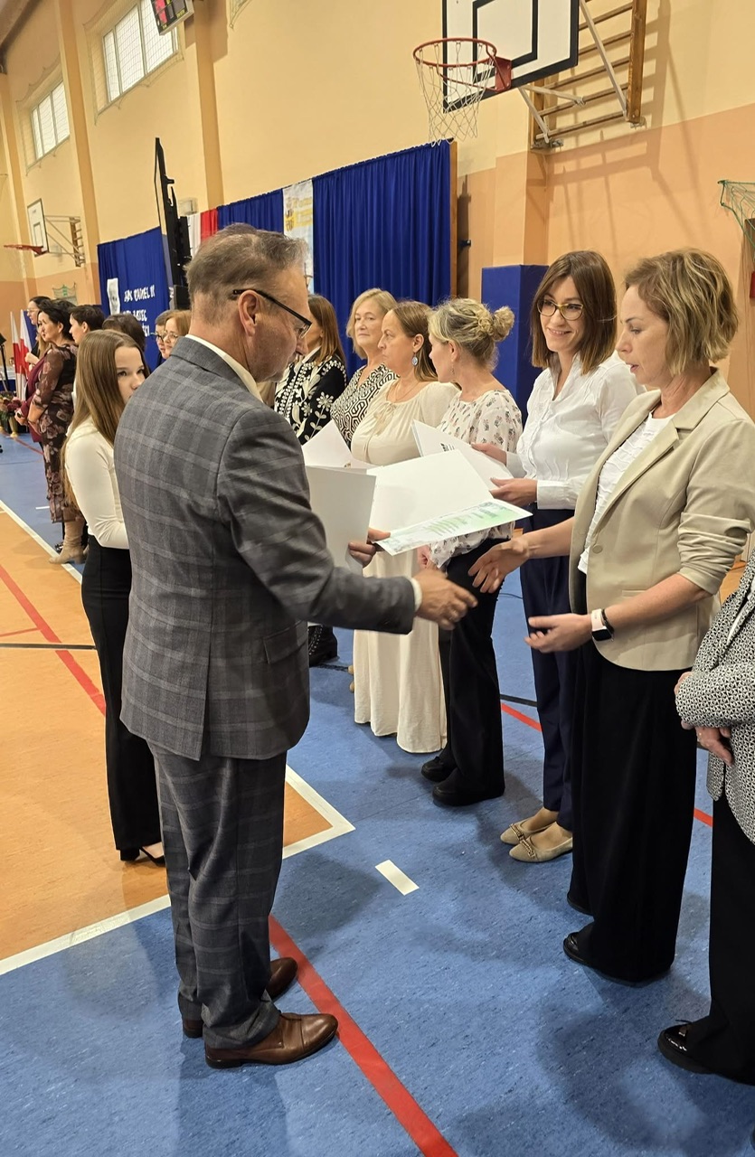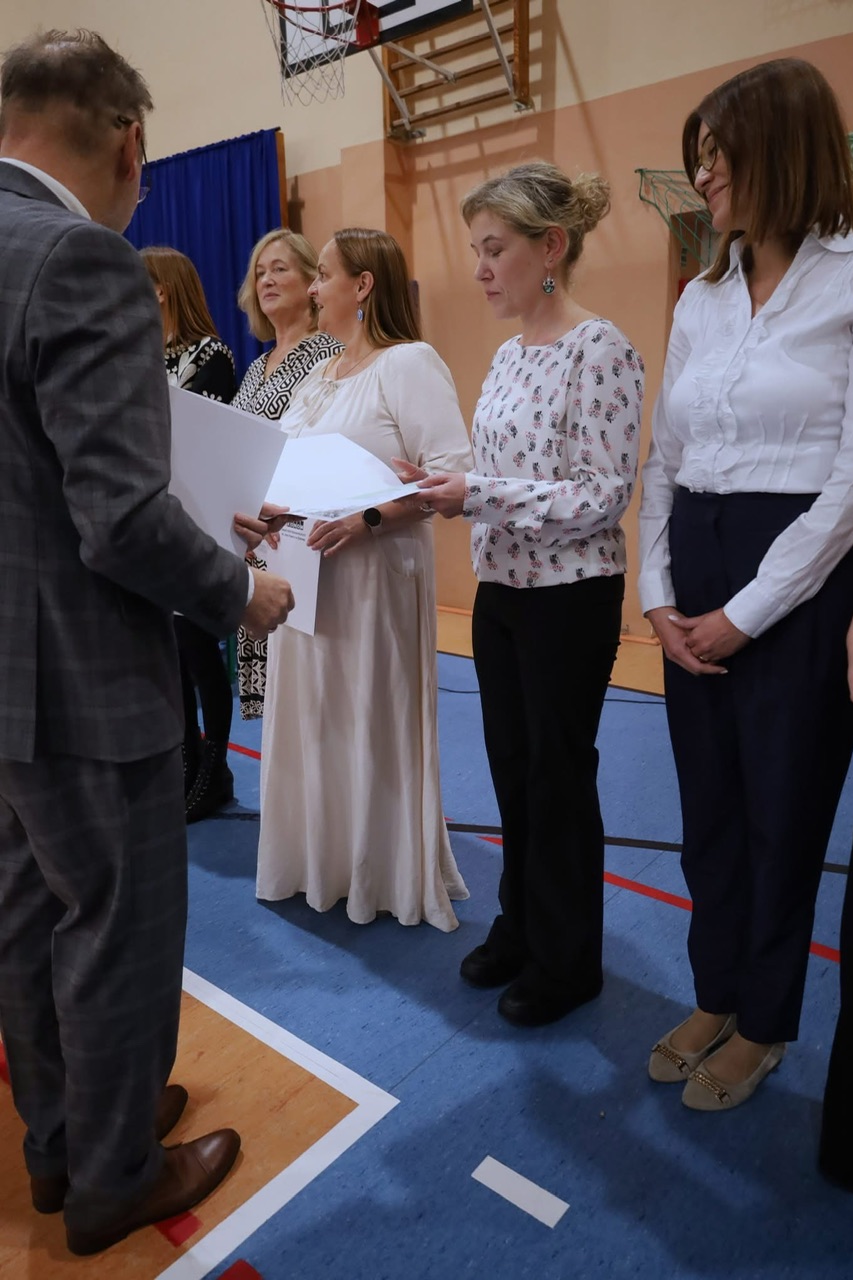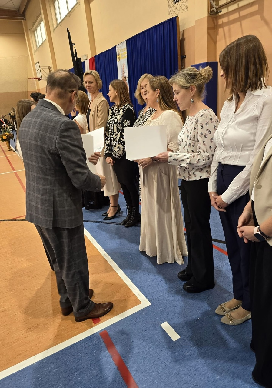 Podczas uroczystości Dyrektor szkoły wręczył nagrody nauczycielkom, nauczycielom oraz pracownikom administracji i obsługi, dziękując im za sumienną pracę, pasję i zaangażowanie w rozwój uczniów. Każde słowo uznania podkreślało, jak ogromną rolę odgrywa ich codzienny trud w budowaniu przyszłości młodych ludzi.