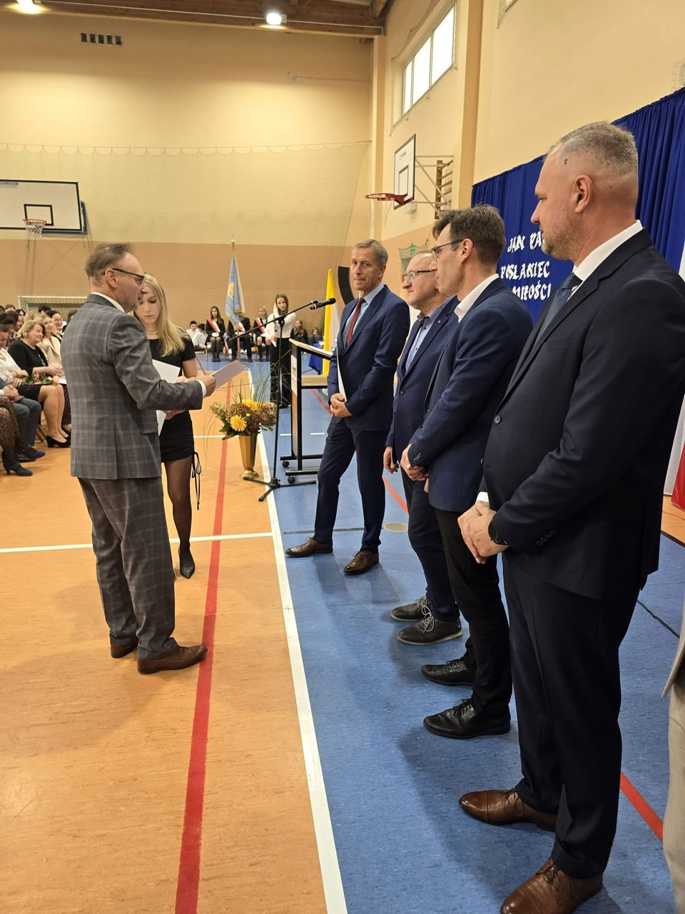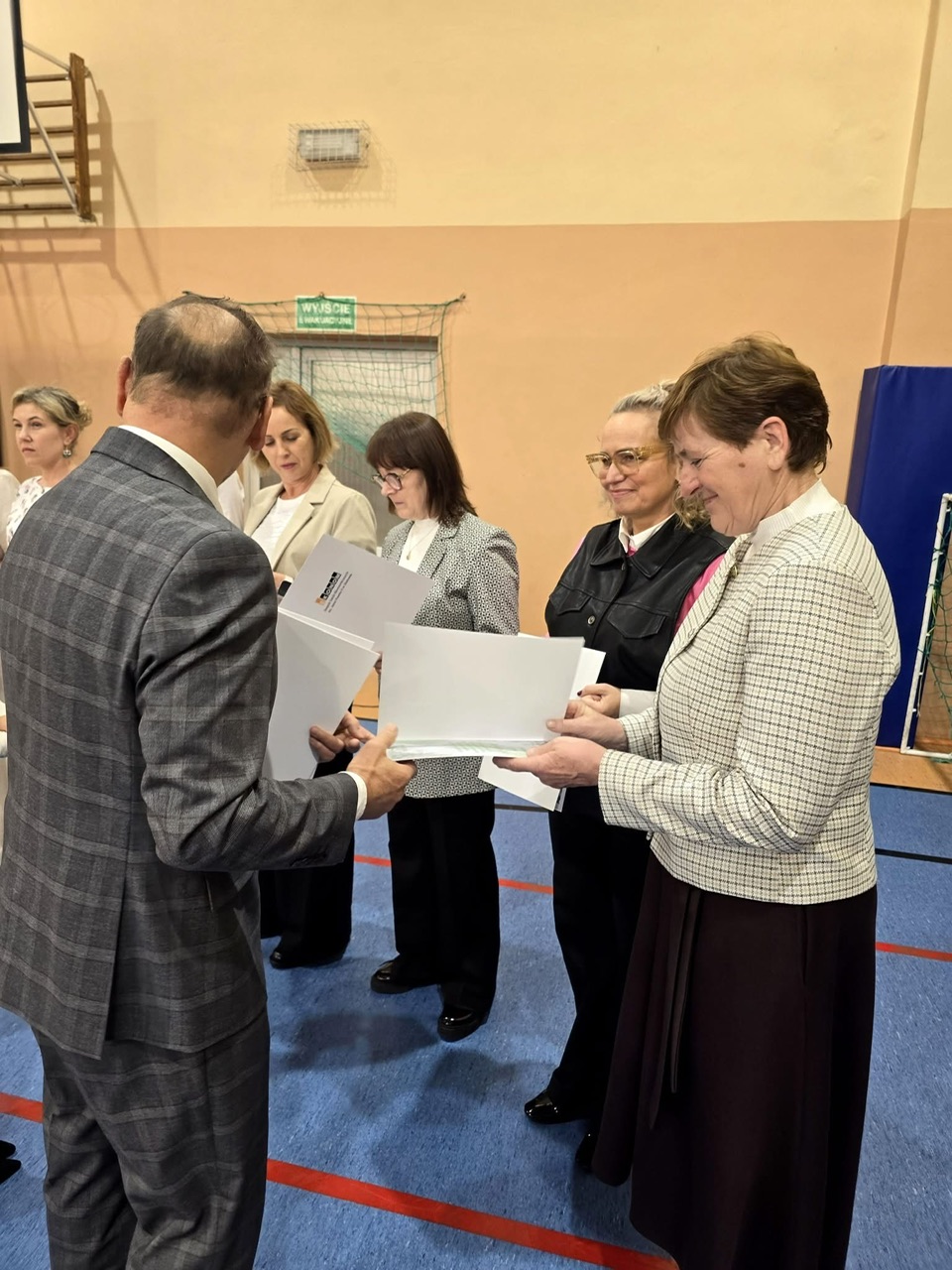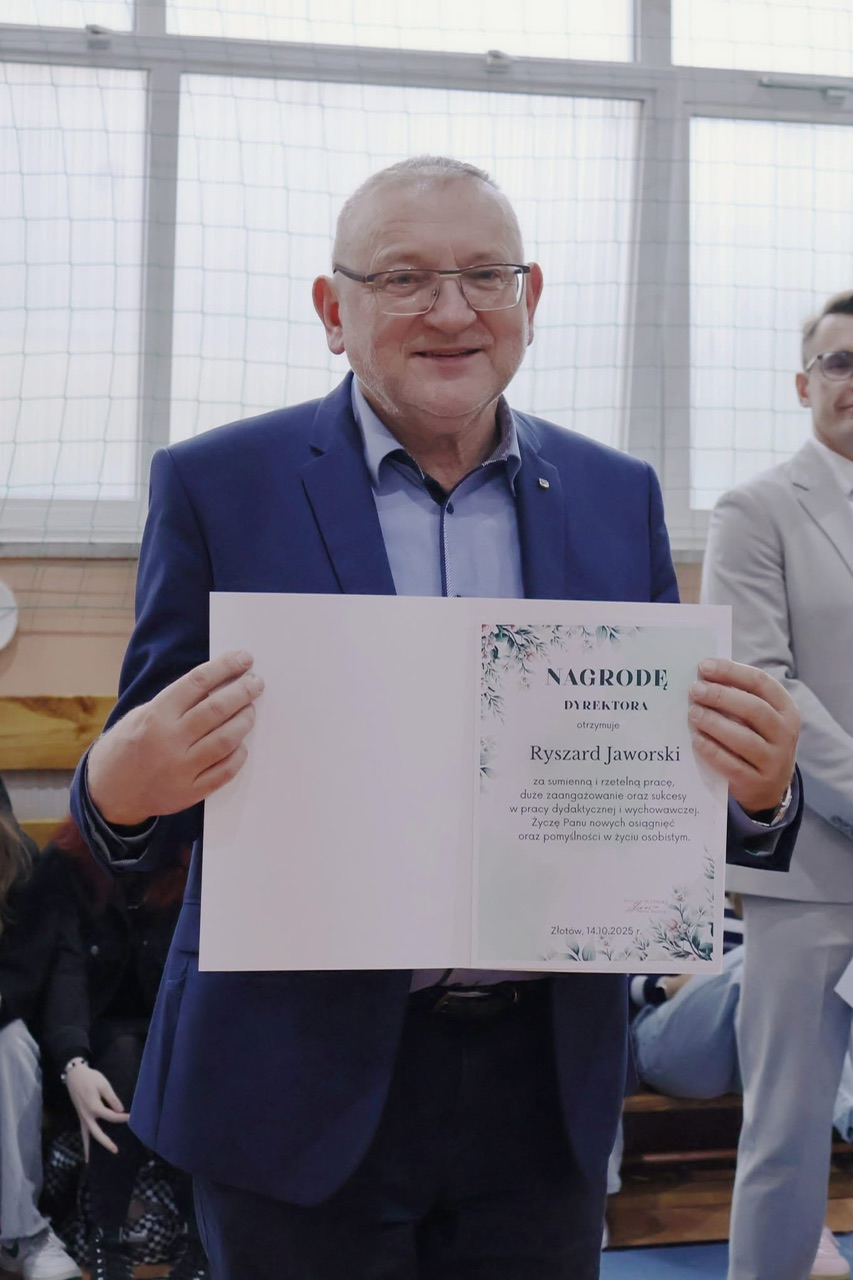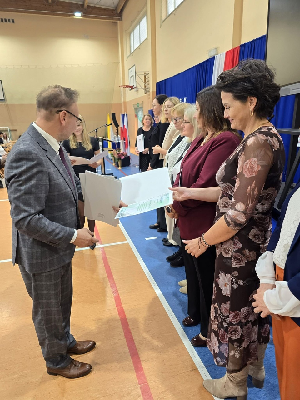 Podczas uroczystości Dyrektor szkoły wręczył nagrody nauczycielkom, nauczycielom oraz pracownikom administracji i obsługi, dziękując im za sumienną pracę, pasję i zaangażowanie w rozwój uczniów. Każde słowo uznania podkreślało, jak ogromną rolę odgrywa ich codzienny trud w budowaniu przyszłości młodych ludzi.
