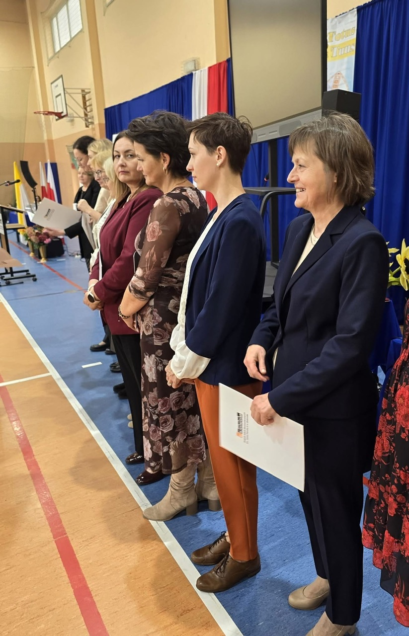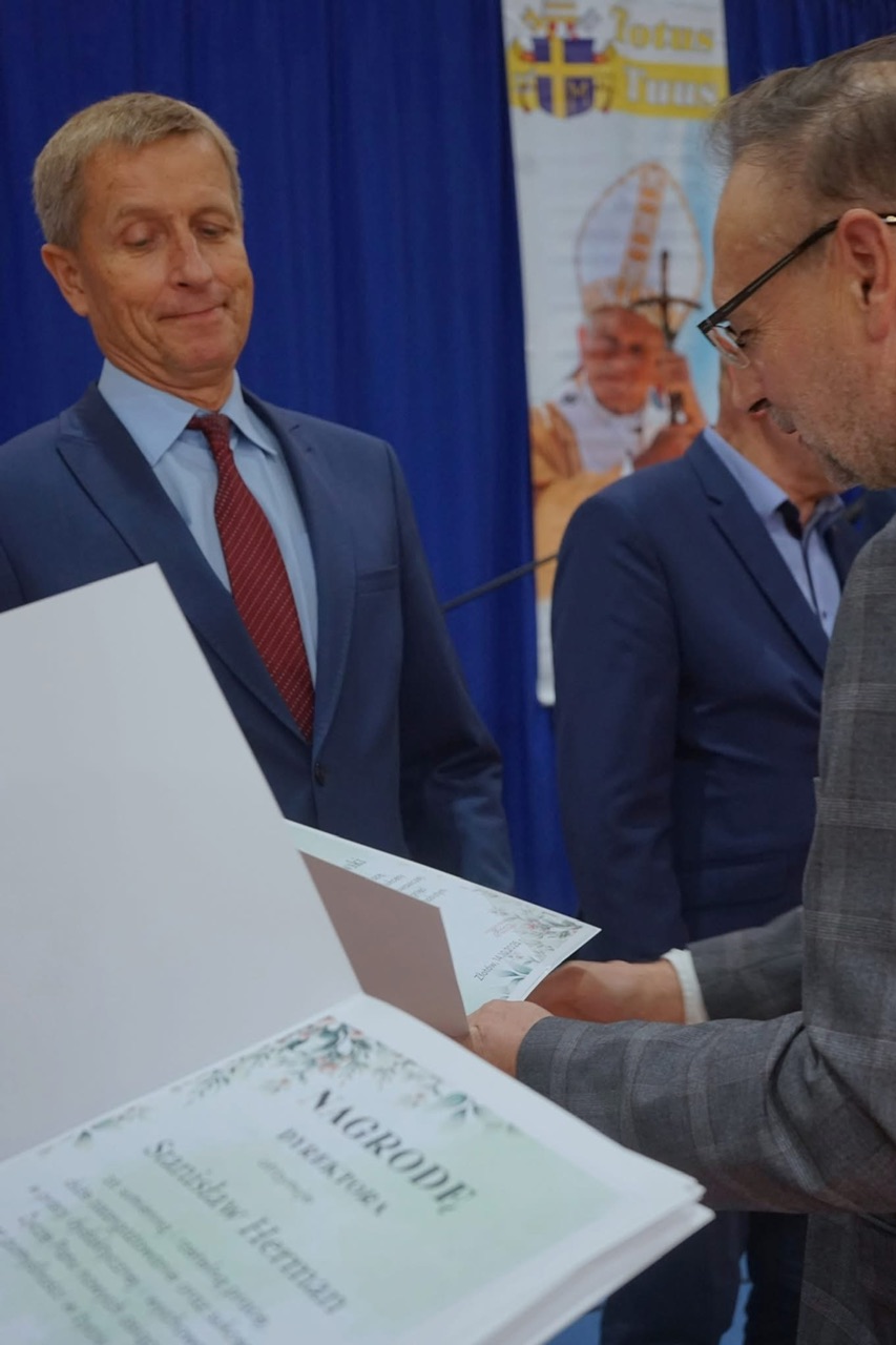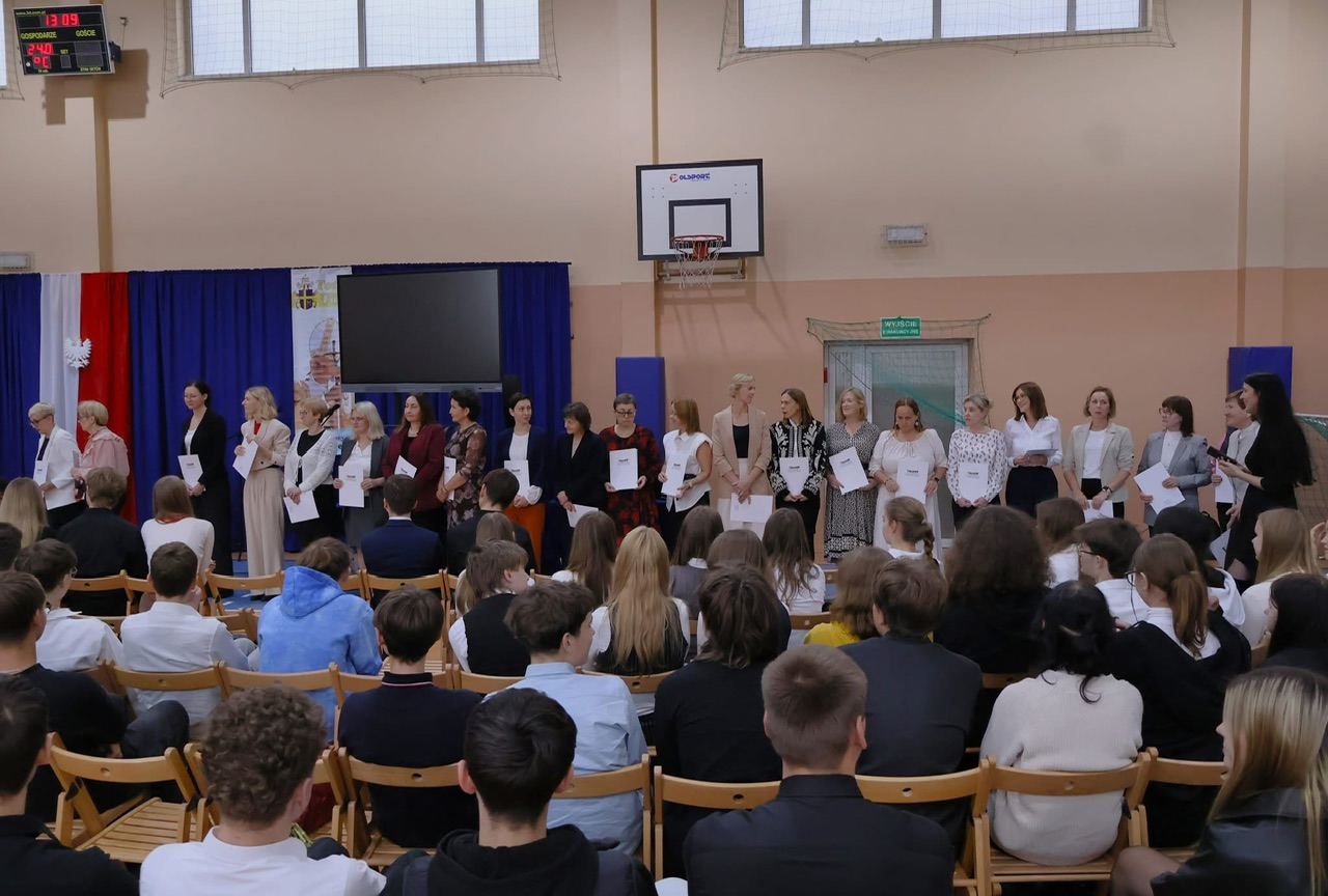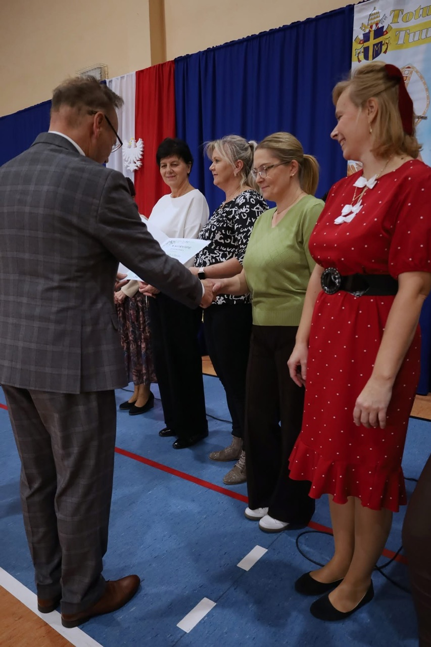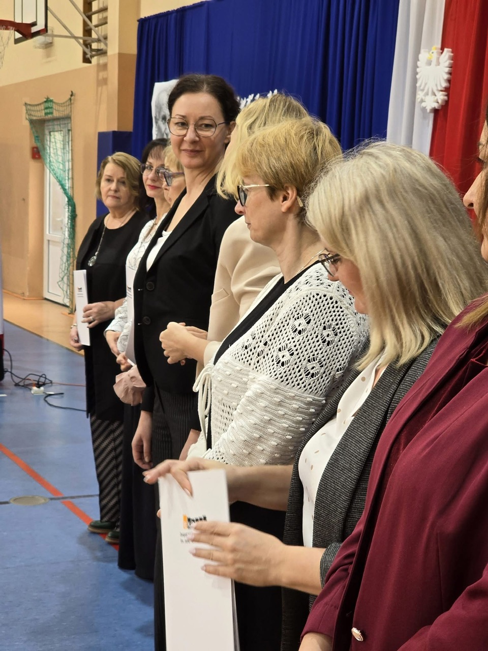 Podczas uroczystości Dyrektor szkoły wręczył nagrody nauczycielkom, nauczycielom oraz pracownikom administracji i obsługi, dziękując im za sumienną pracę, pasję i zaangażowanie w rozwój uczniów. Każde słowo uznania podkreślało, jak ogromną rolę odgrywa ich codzienny trud w budowaniu przyszłości młodych ludzi.
