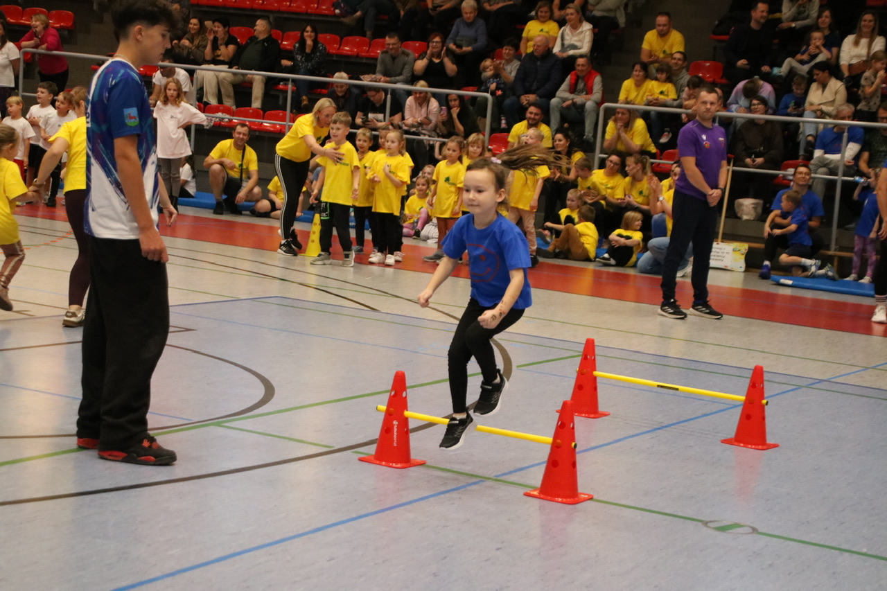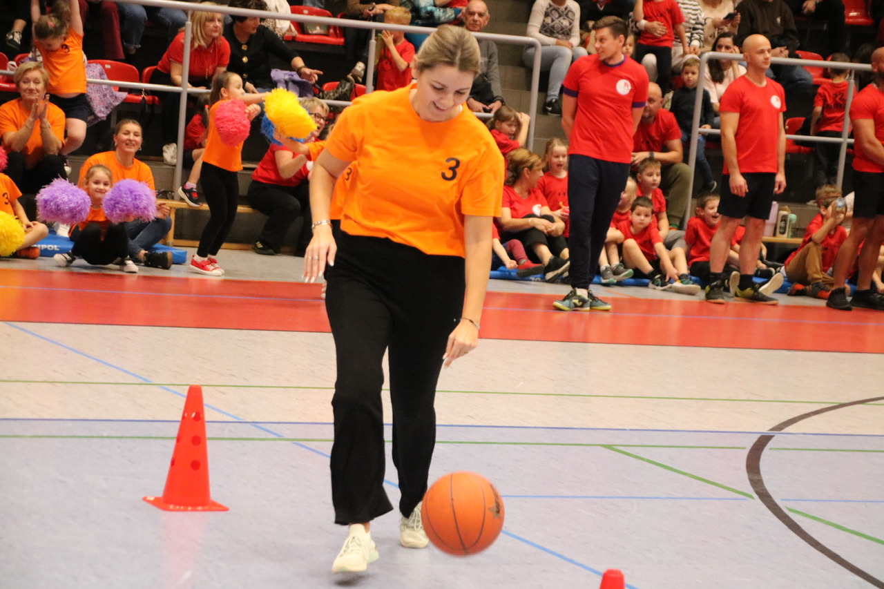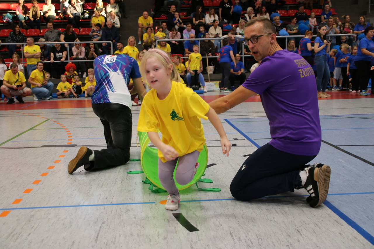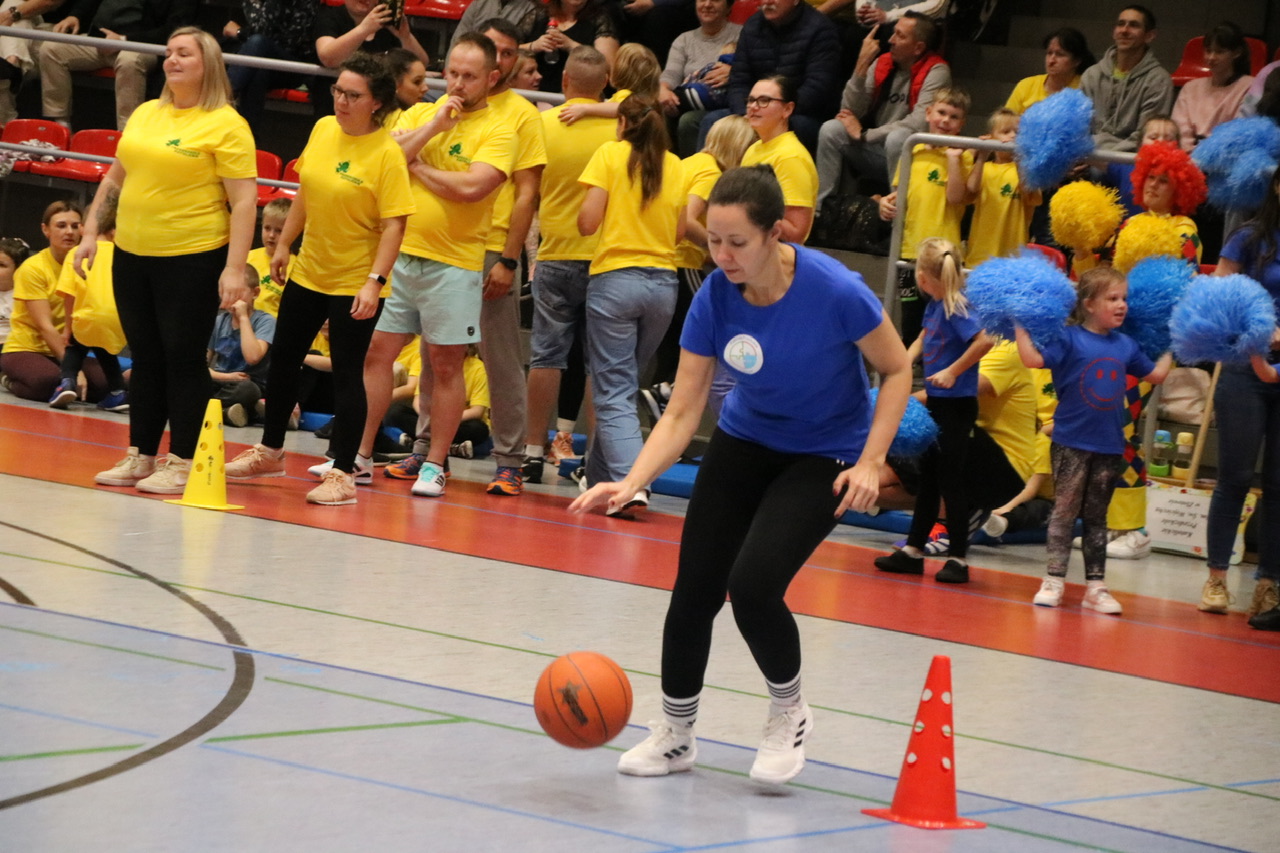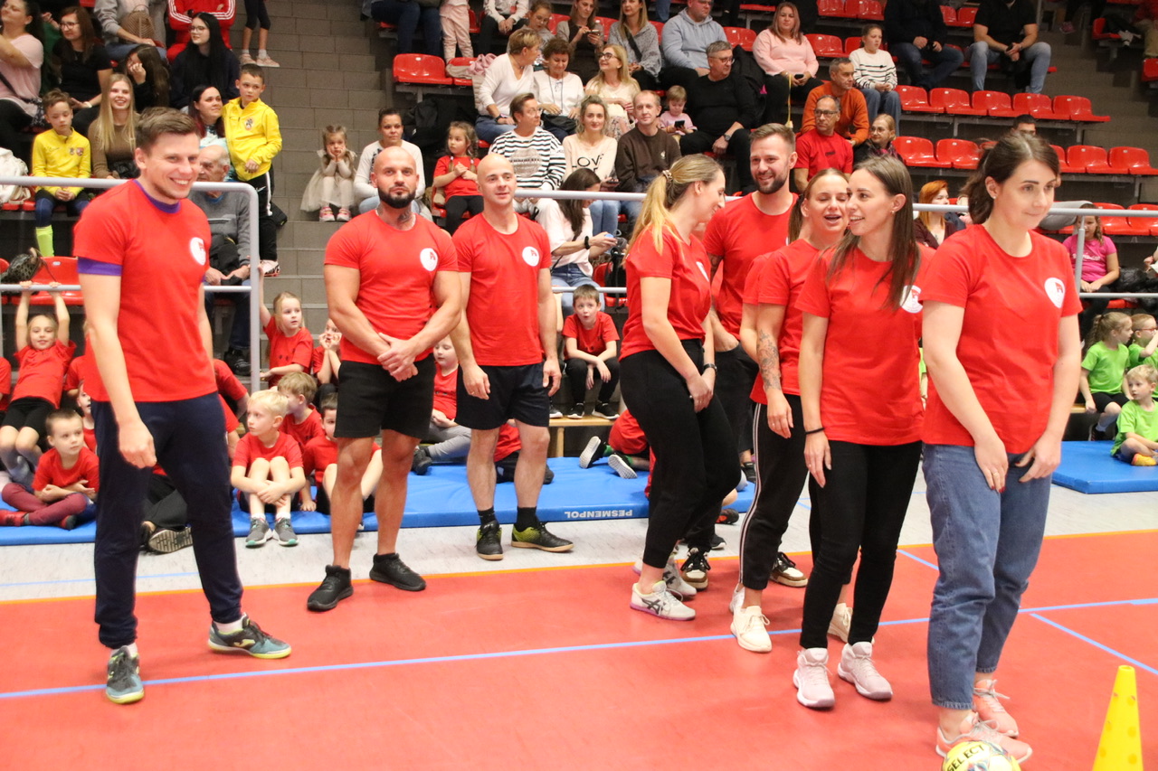 W drugiej części wydarzenia do sportowej zabawy dołączyli… rodzice! Ich konkurencje wywołały salwy śmiechu i gromkie brawa publiczności. Zaangażowanie dorosłych, doping dzieci i rodzinna atmosfera sprawiły, że trybuny tętniły pozytywną energią, a hala rozbrzmiewała aplauzem i wspólną radością.