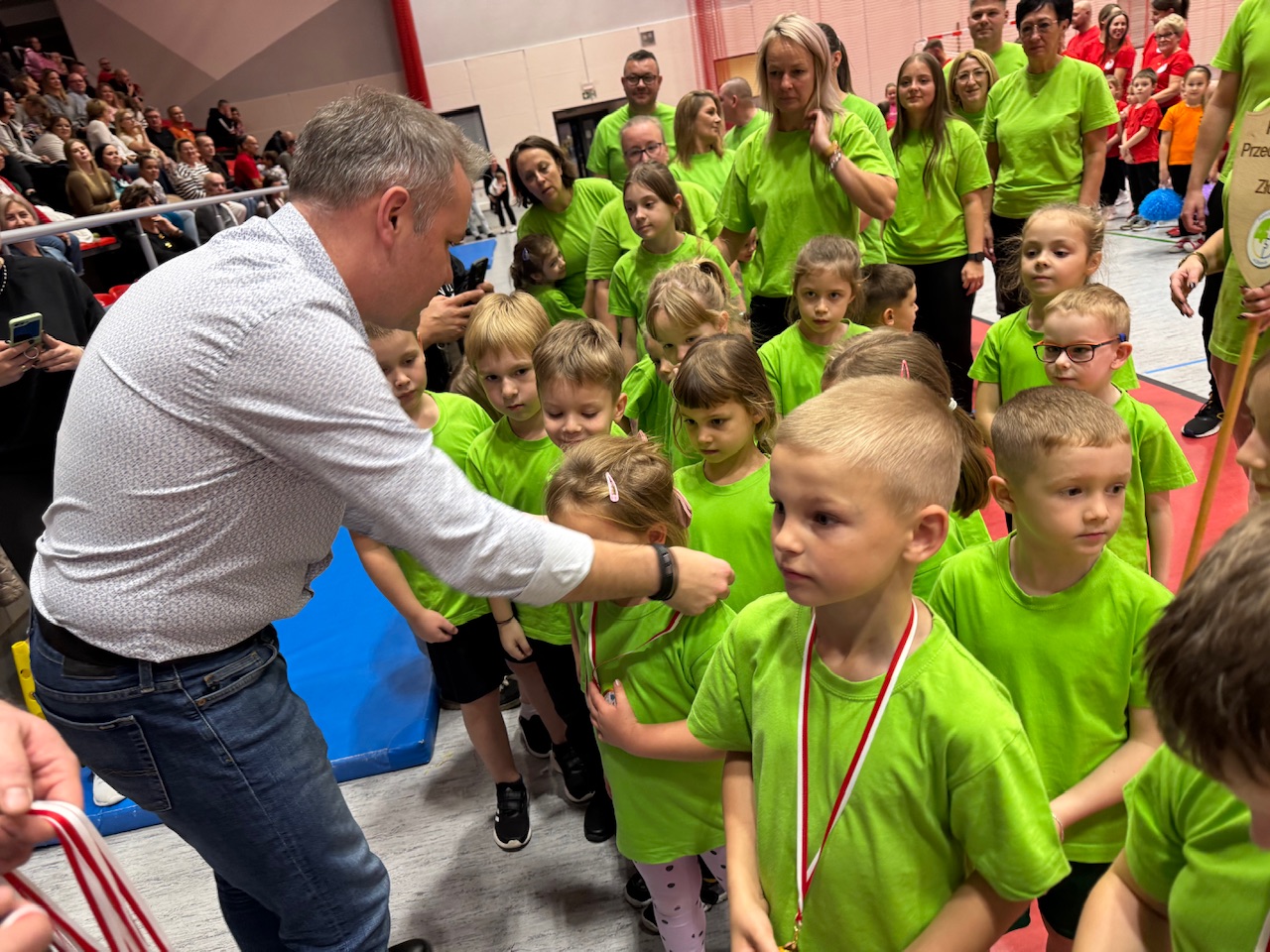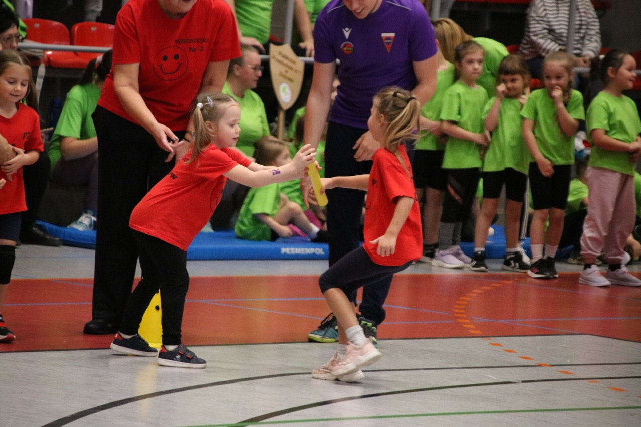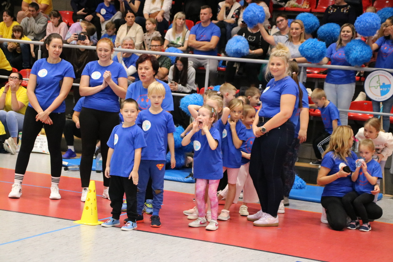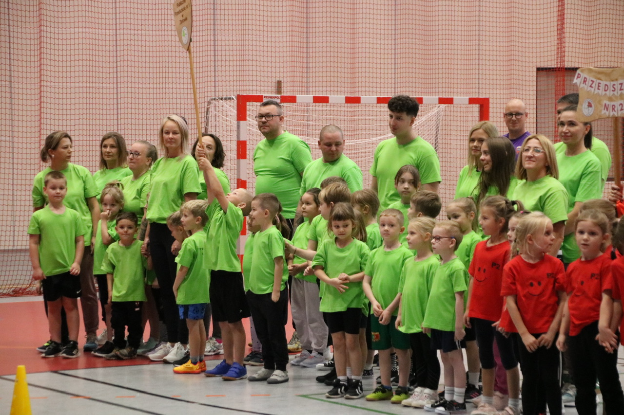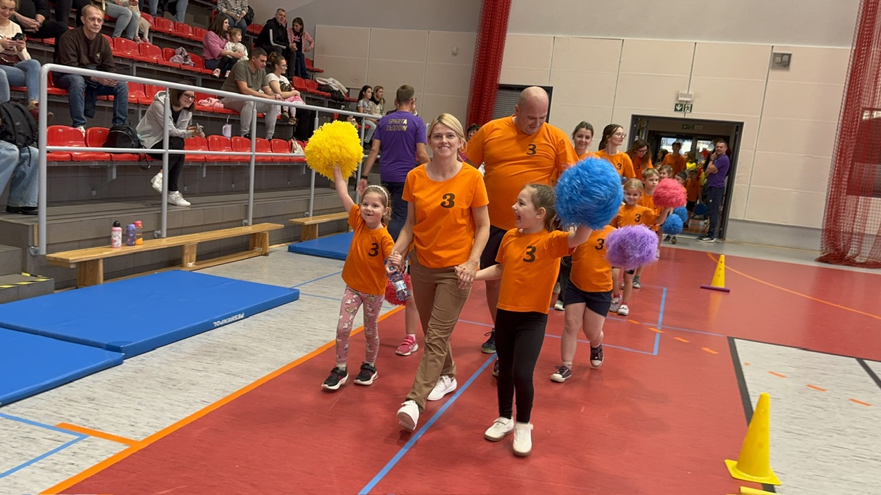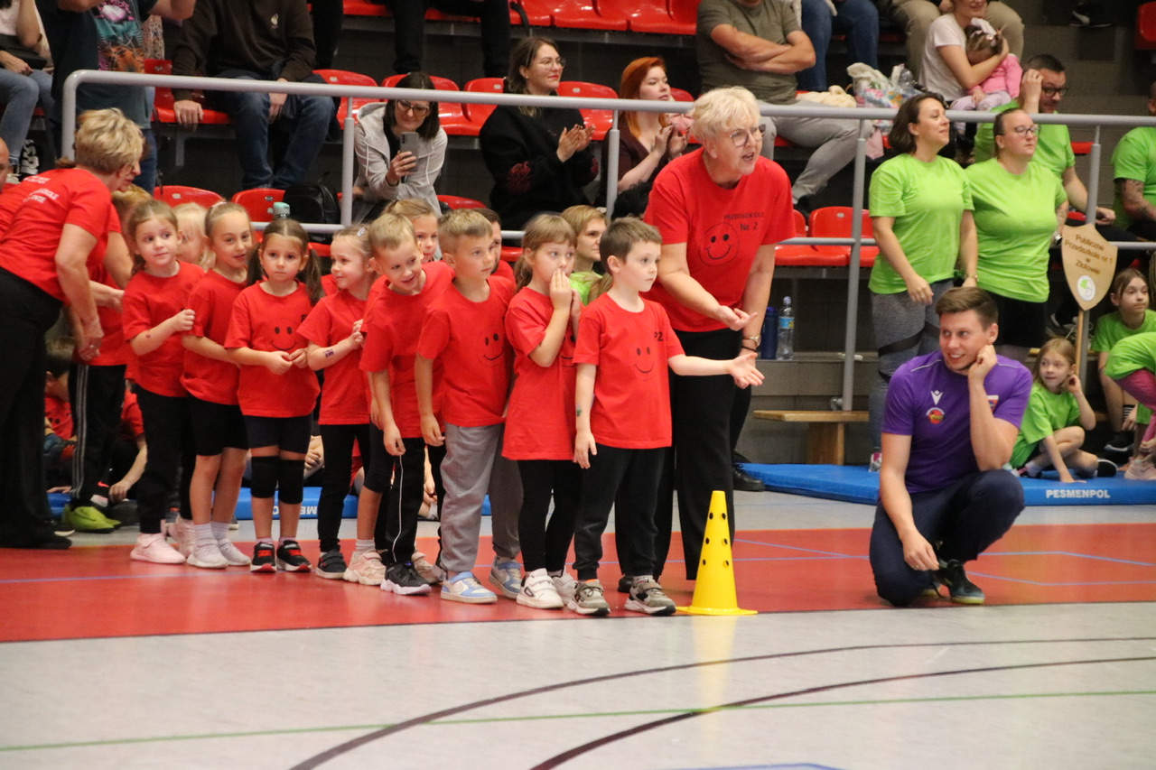 W drugiej części wydarzenia do sportowej zabawy dołączyli… rodzice! Ich konkurencje wywołały salwy śmiechu i gromkie brawa publiczności. Zaangażowanie dorosłych, doping dzieci i rodzinna atmosfera sprawiły, że trybuny tętniły pozytywną energią, a hala rozbrzmiewała aplauzem i wspólną radością.