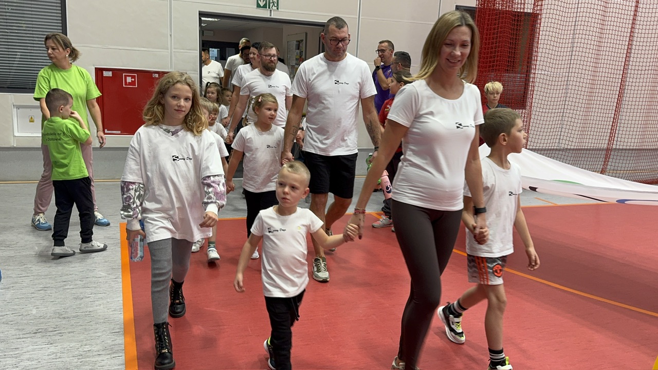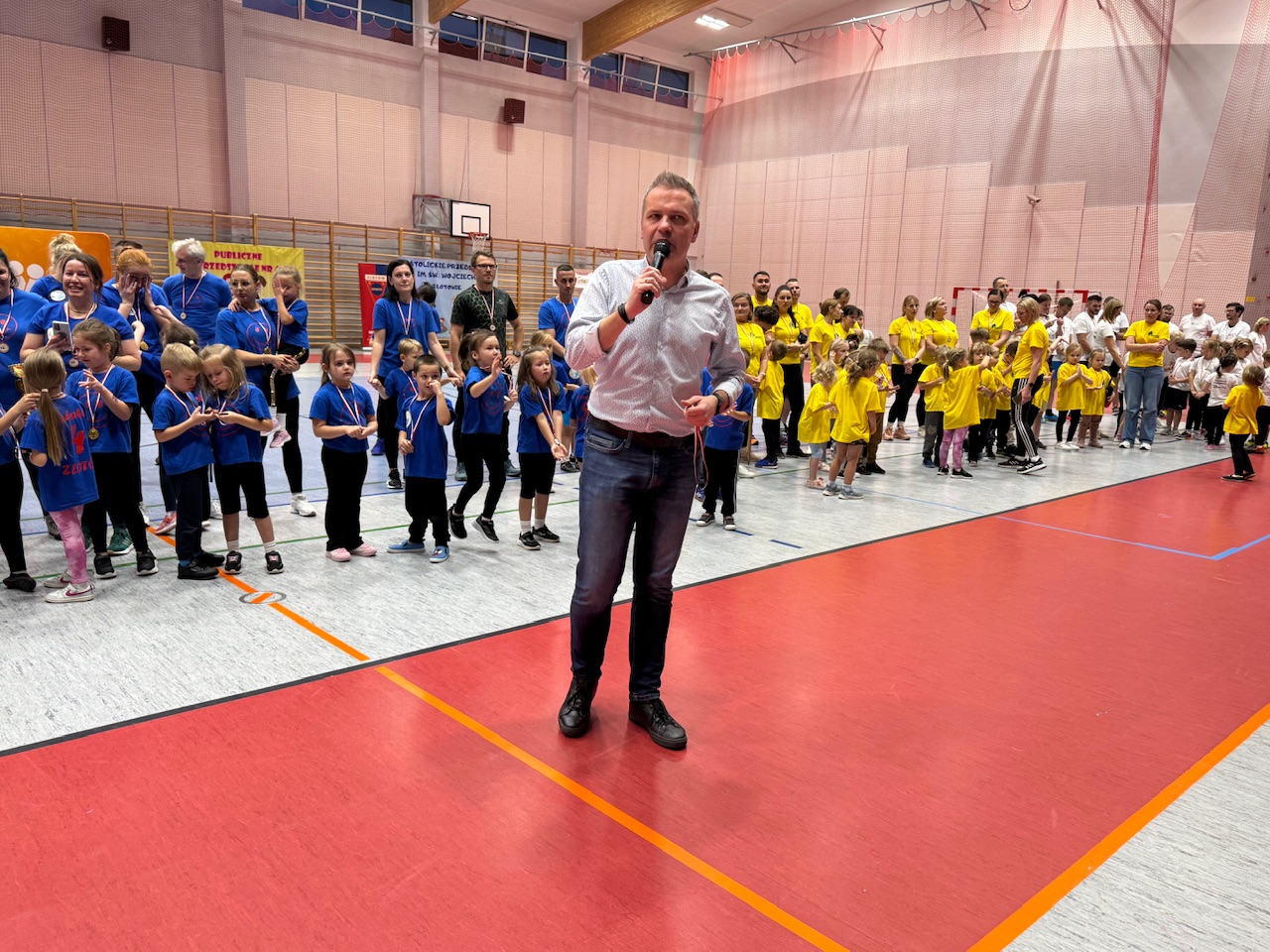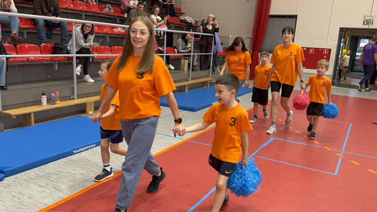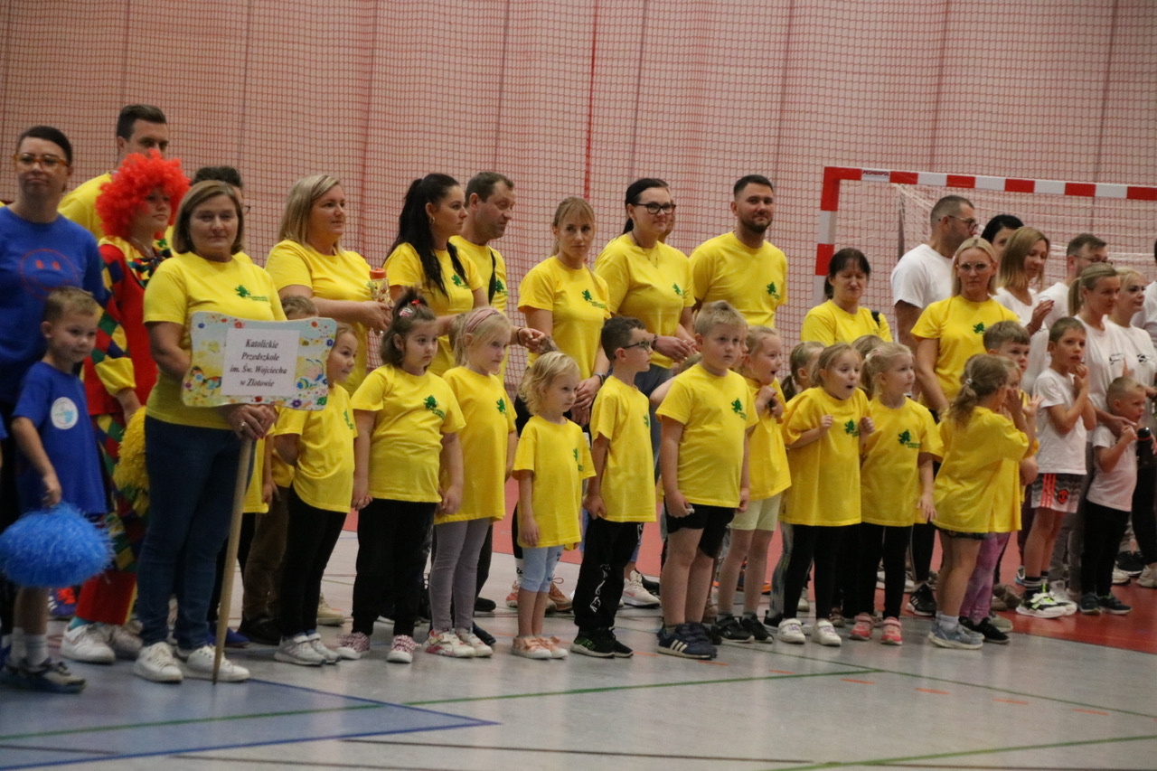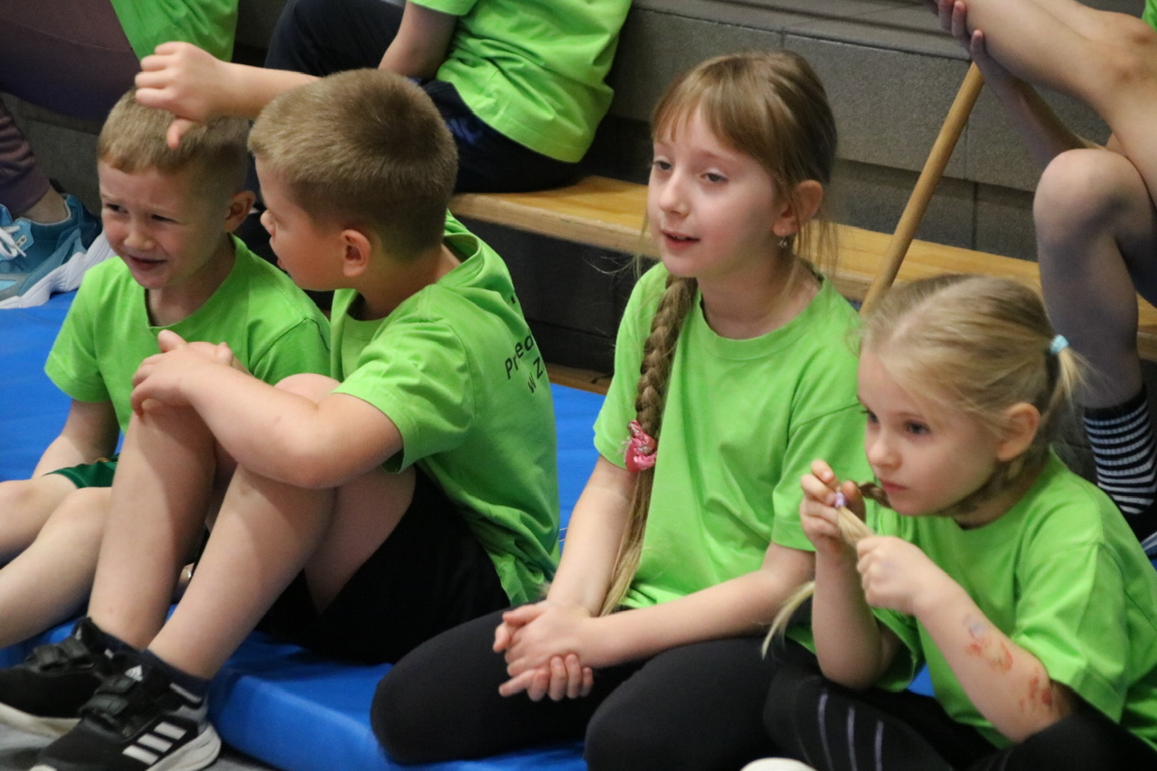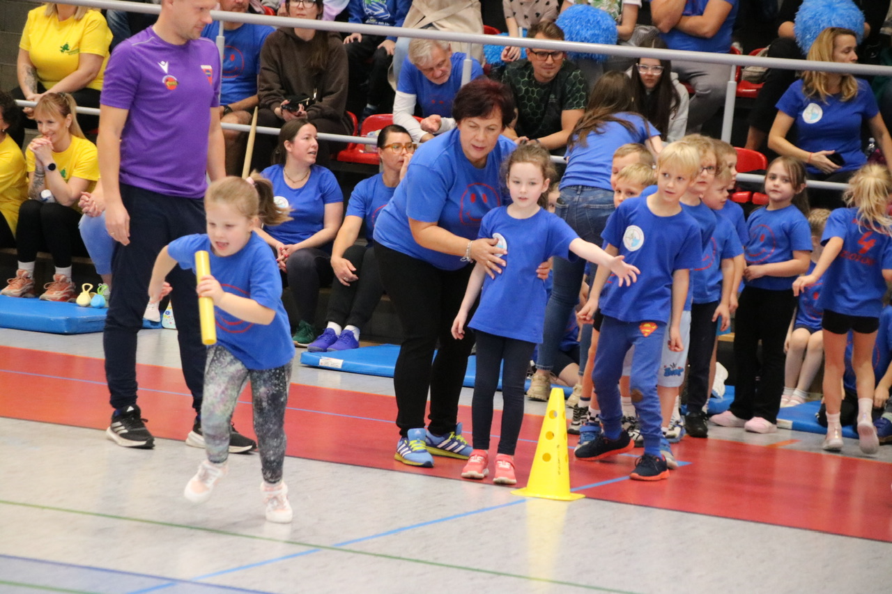 W drugiej części wydarzenia do sportowej zabawy dołączyli… rodzice! Ich konkurencje wywołały salwy śmiechu i gromkie brawa publiczności. Zaangażowanie dorosłych, doping dzieci i rodzinna atmosfera sprawiły, że trybuny tętniły pozytywną energią, a hala rozbrzmiewała aplauzem i wspólną radością.