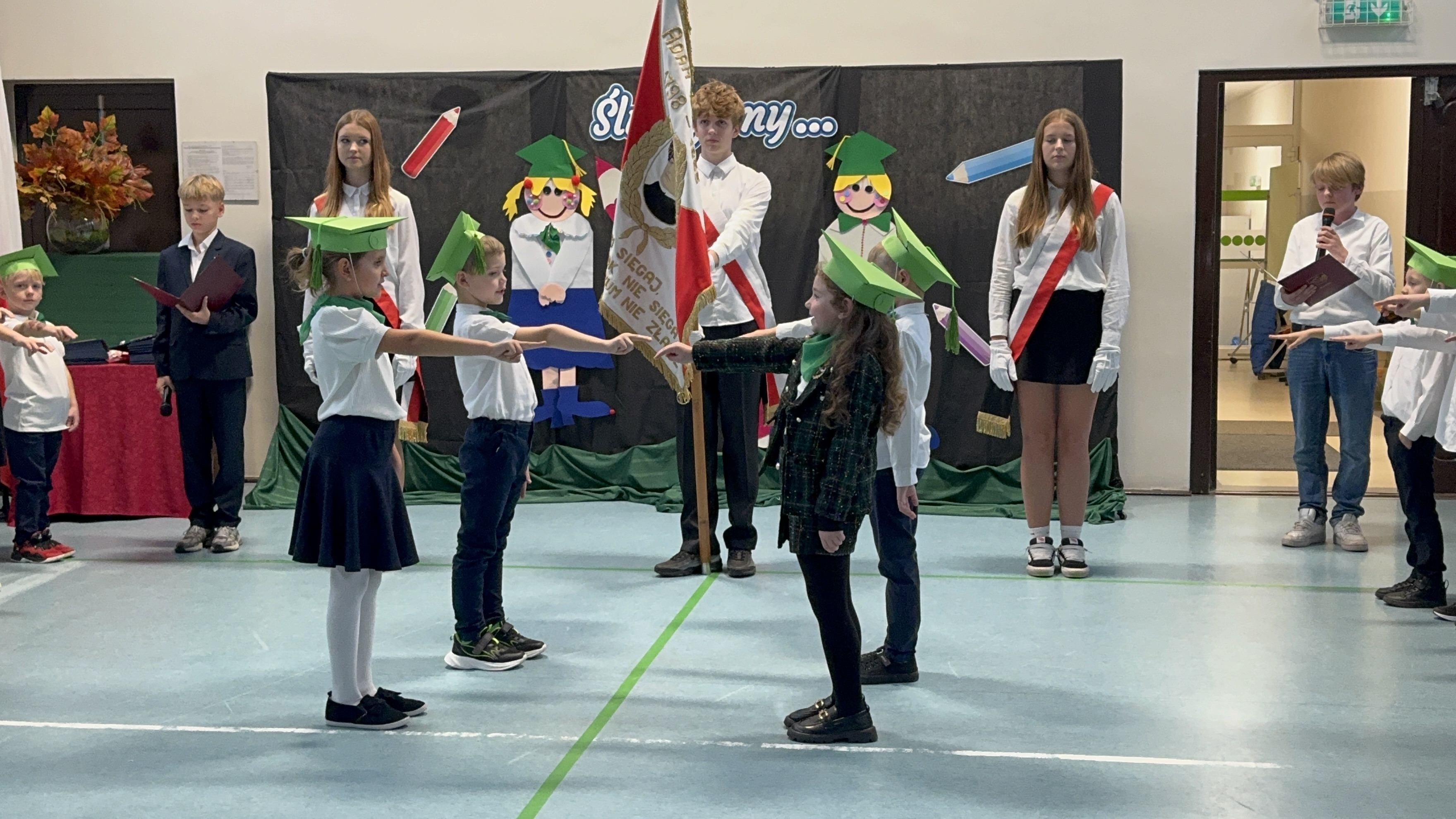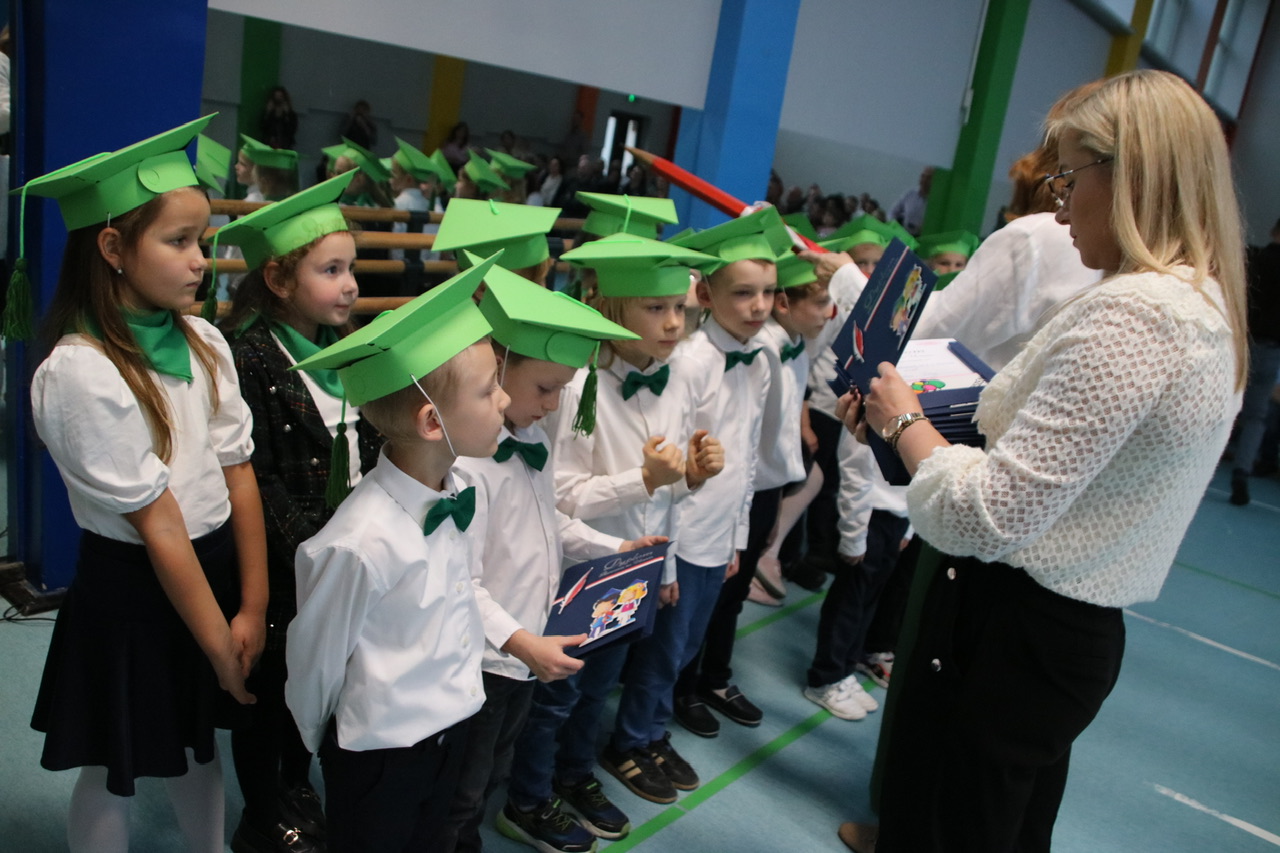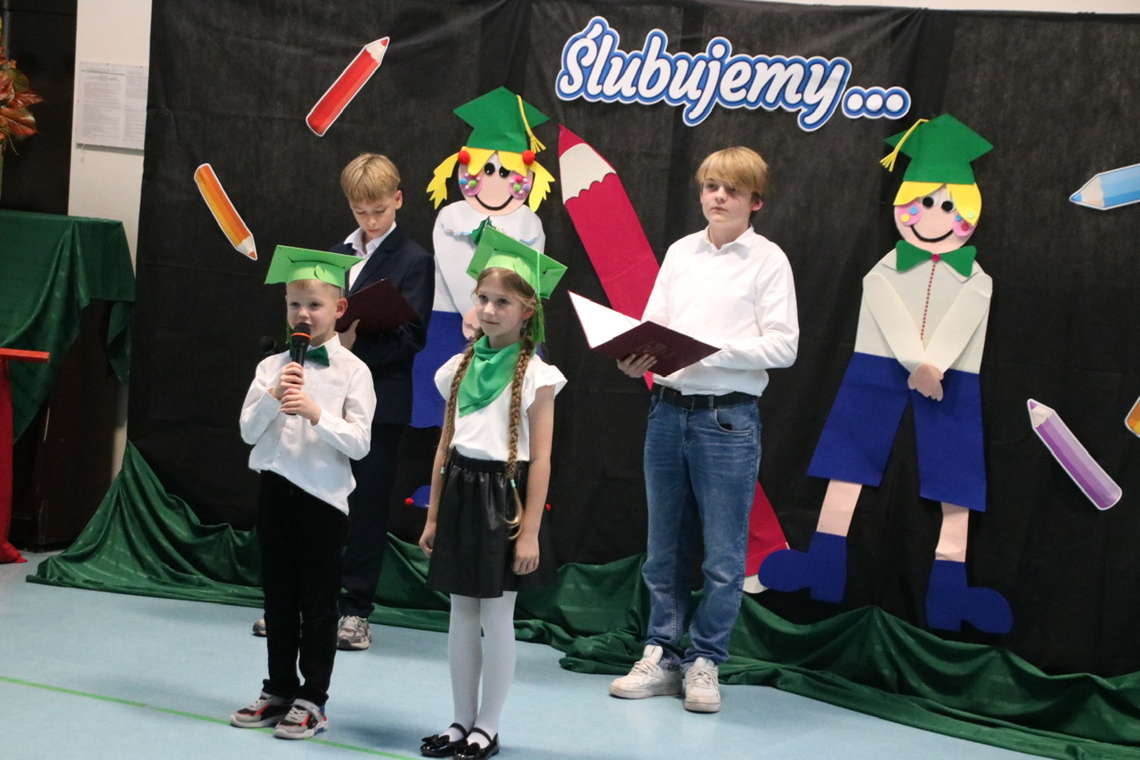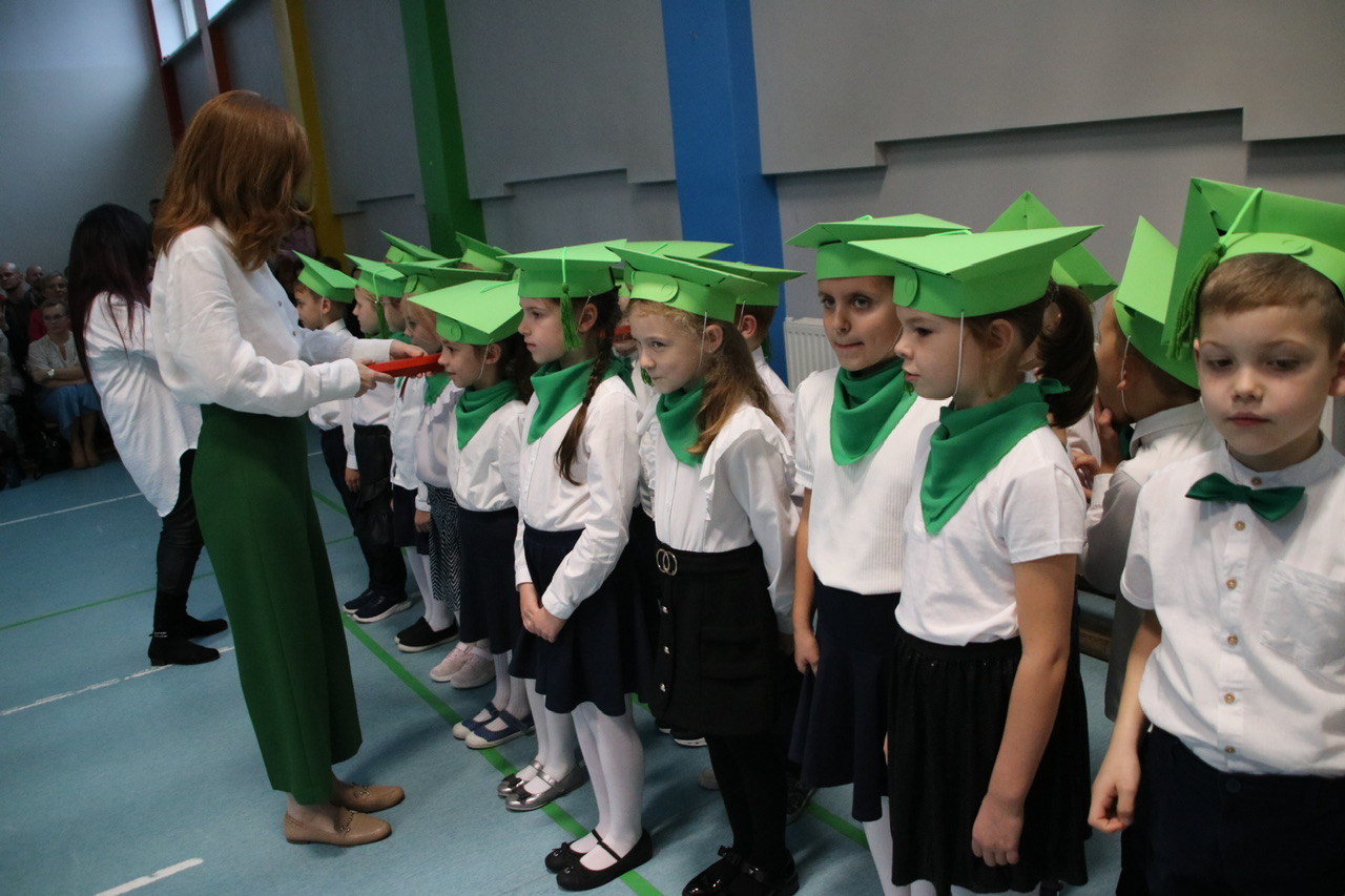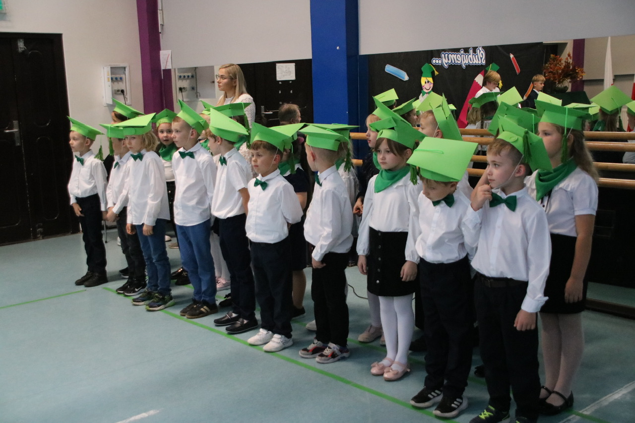 Najmłodsi uczniowie, w odświętnych strojach, z powagą ślubowali na sztandar szkoły, obiecując pilnie się uczyć, szanować nauczycieli, kolegów oraz dbać o dobre imię szkoły. Był to wyjątkowy moment, który wielu z nich zapamięta na długo.