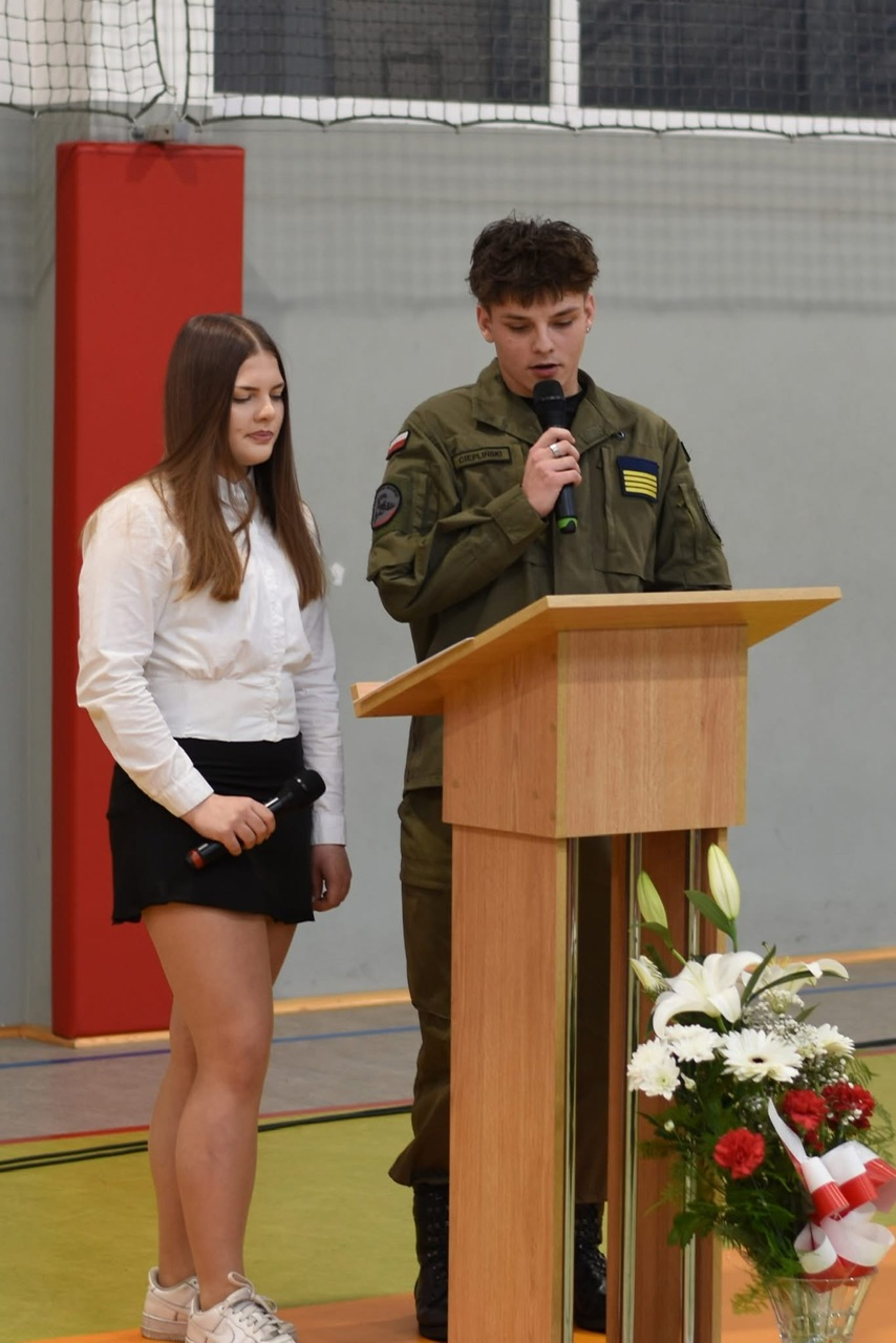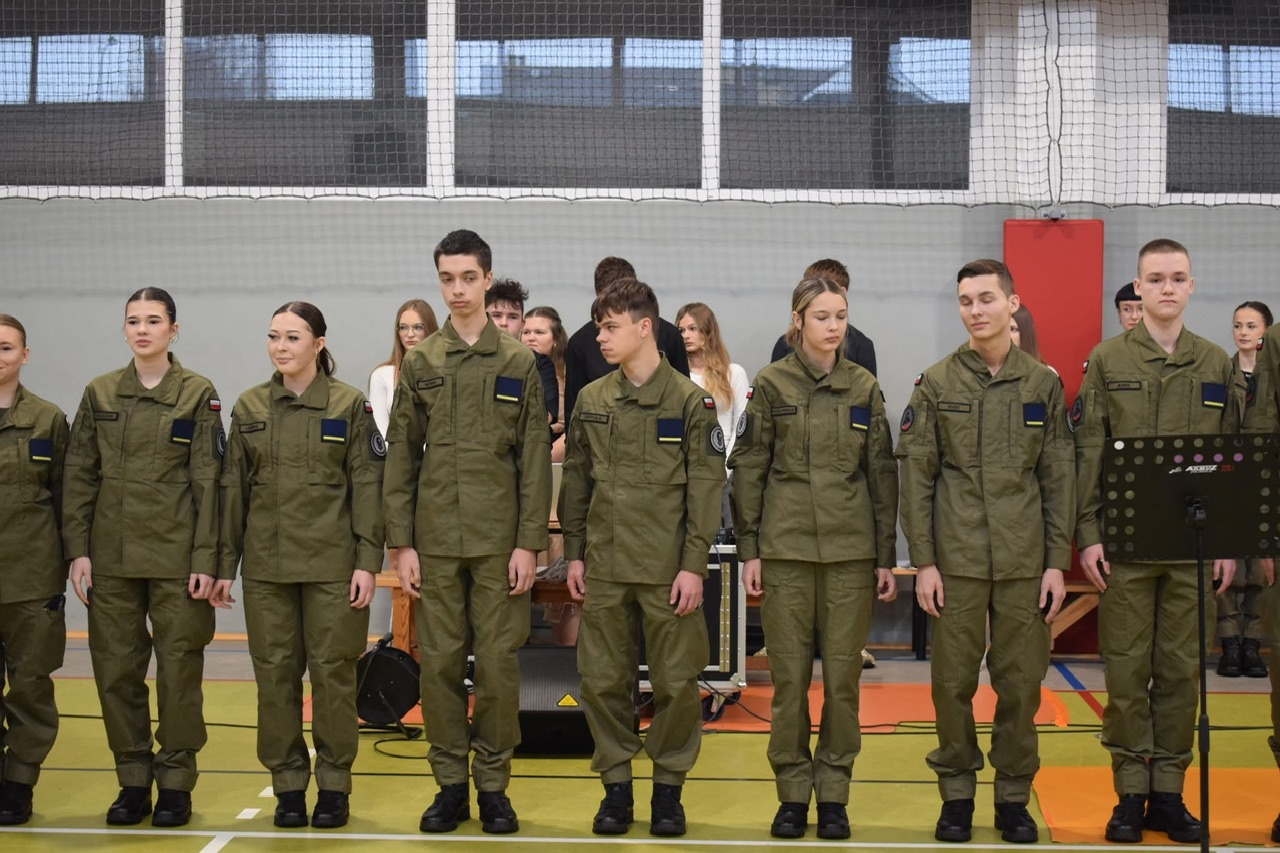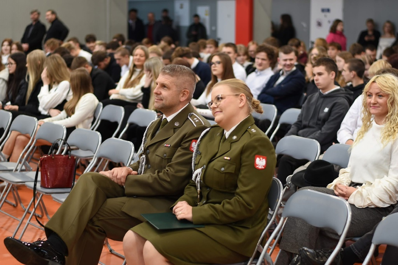 Podczas uroczystości pierwszoklasiści złożyli ślubowanie na sztandar szkoły, symbolicznie stając się pełnoprawnymi członkami szkolnej społeczności. Wśród nich znaleźli się uczniowie klasy objętej patronatem Ministerstwa Obrony Narodowej, którzy otrzymali z rąk pani podporucznik Anny Gomołysek z 122 batalionu lekkiej piechoty w Dolaszewie oficjalne emblematy mundurowe. Ten gest był nie tylko wyróżnieniem, ale i wyrazem zaufania oraz dumy z młodego pokolenia, które z zaangażowaniem podejmuje służbę na rzecz ojczyzny.