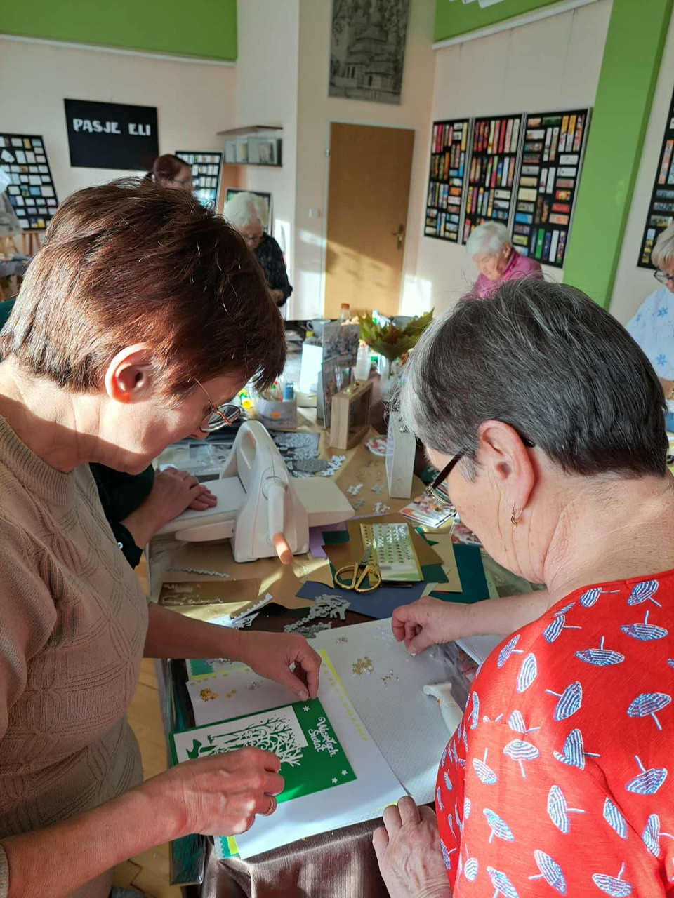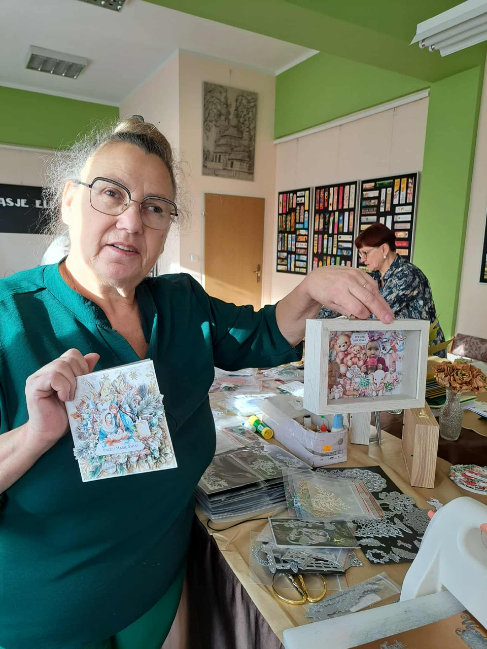 Spotkanie poprowadziła niezastąpiona Renata Białowąs – pasjonatka z ogromnym talentem i jeszcze większym sercem do dzielenia się swoją wiedzą. Przywiozła ze sobą bogaty zestaw wykrojników, wzorów i inspiracji, które stały się punktem wyjścia do prawdziwie artystycznych eksperymentów. Uczestnicy – bez względu na wiek – z zaangażowaniem tworzyli własne, niepowtarzalne świąteczne kartki.