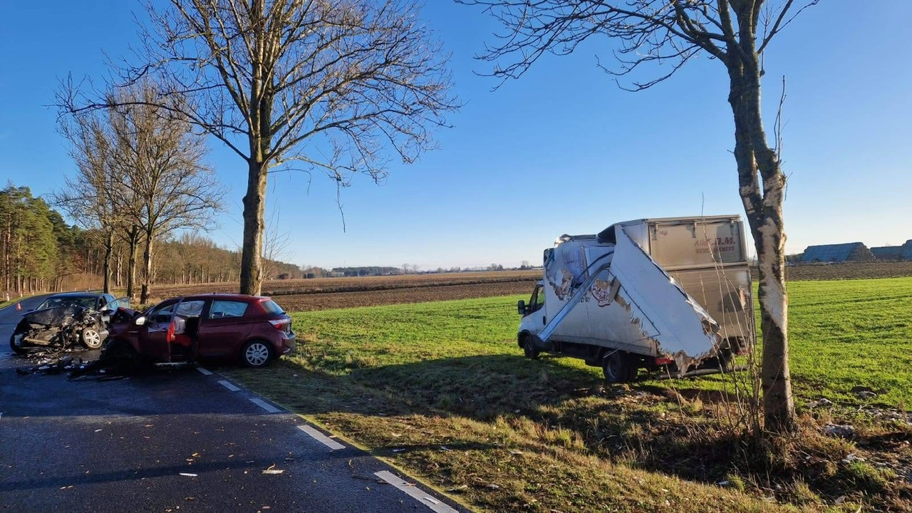 W tym samym czasie kierowca samochodu dostawczego Iveco, chcąc uniknąć kolizji z obydwoma pojazdami, gwałtownie zjechał na pobocze. Pojazd wpadł do przydrożnego rowu i uderzył w drzewo. Na szczęście prowadzący dostawczaka nie odniósł obrażeń.