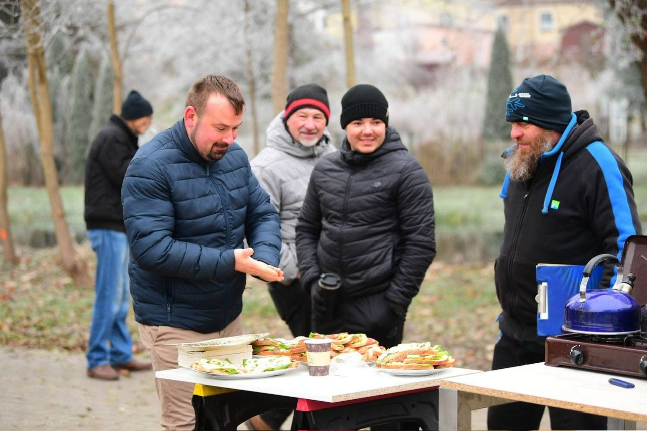 Już od wczesnych godzin porannych na uczestników czekało ciepłe przyjęcie. Organizatorzy zadbali o śniadanie, gorącą herbatę, kawę oraz świeże placki, które dodały energii przed rozpoczęciem zmagań. Rozmowy, uśmiechy i pierwsze prognozy na temat brań skutecznie rozgrzewały atmosferę, choć termometry jasno pokazywały, że łatwo tego dnia nie będzie.