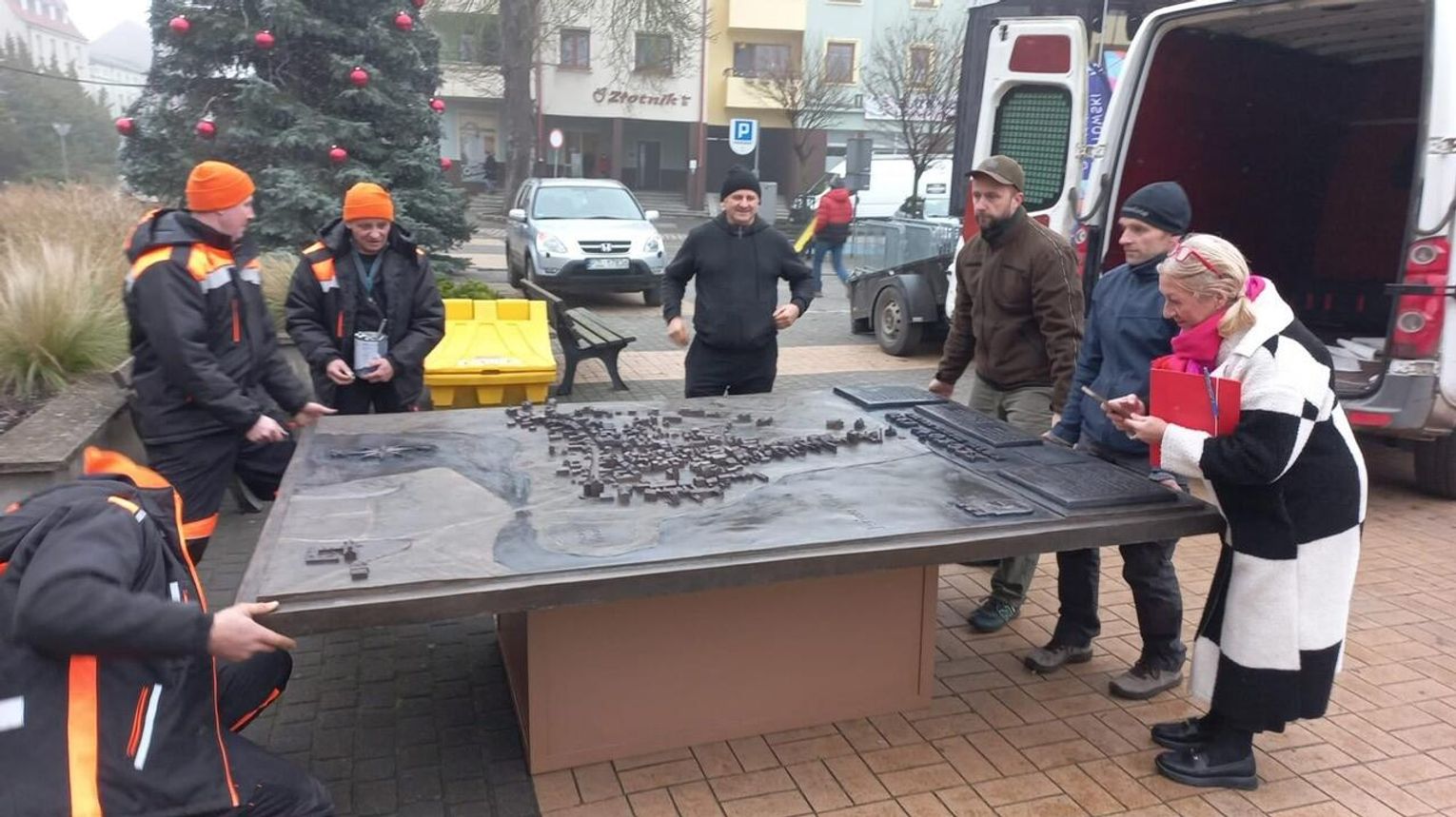Makieta, mierząca 260 na 190 centymetrów, została umieszczona pomiędzy dwoma klombami – dokładnie w miejscu, gdzie historia naturalnie splata się z codziennym życiem miasta. Wykonana z trwałych żywic poliestrowych, z elegancką, brązową imitacją wierzchniej warstwy, waży około 300 kilogramów i jest przystosowana zarówno do ekspozycji całorocznej, jak i bezpiecznego demontażu w razie potrzeby.