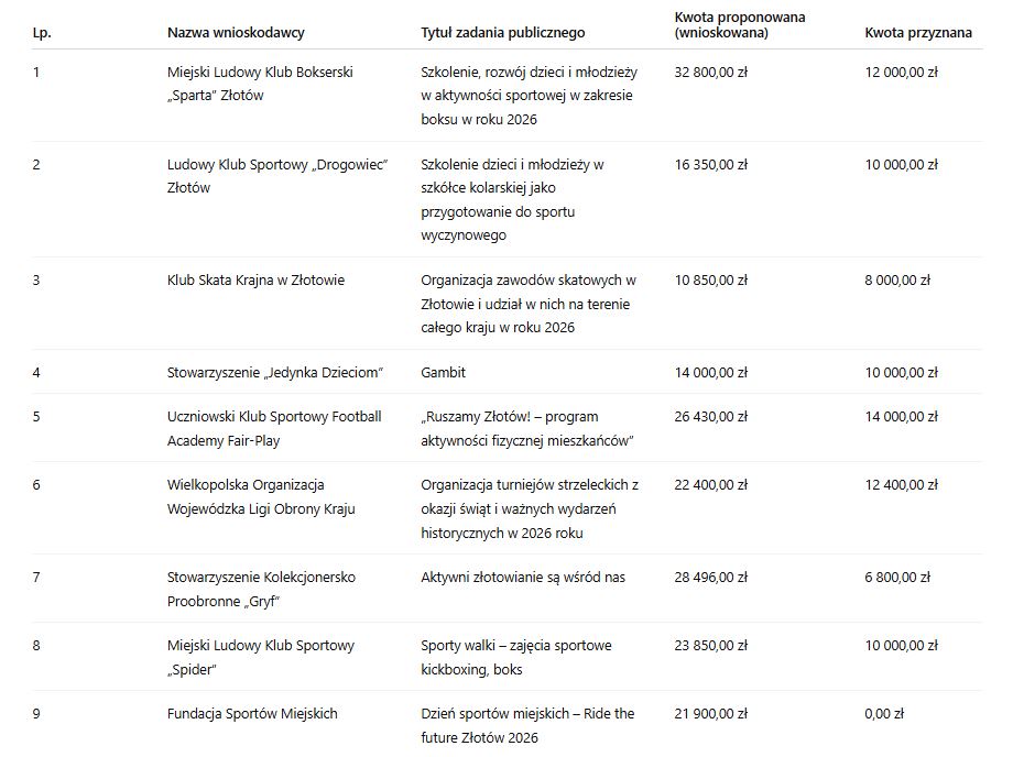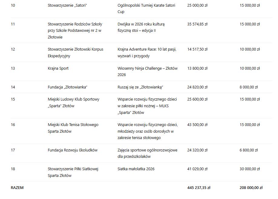 Najwyższe wsparcie, w wysokości 30 tysięcy złotych, otrzymało Stowarzyszenie Piłki Siatkowej Sparta Złotów na realizację projektu „Siatka małolatka 2026”. Dofinansowanie w wysokości 15 tysięcy złotych przyznano m.in. Stowarzyszeniu „Satori” na organizację Ogólnopolskiego Turnieju Karate Satori Cup, Miejskiemu Klubowi Tenisa Stołowego Sparta Złotów oraz MLKS „Sparta” Złotów na rozwój piłki nożnej dzieci.