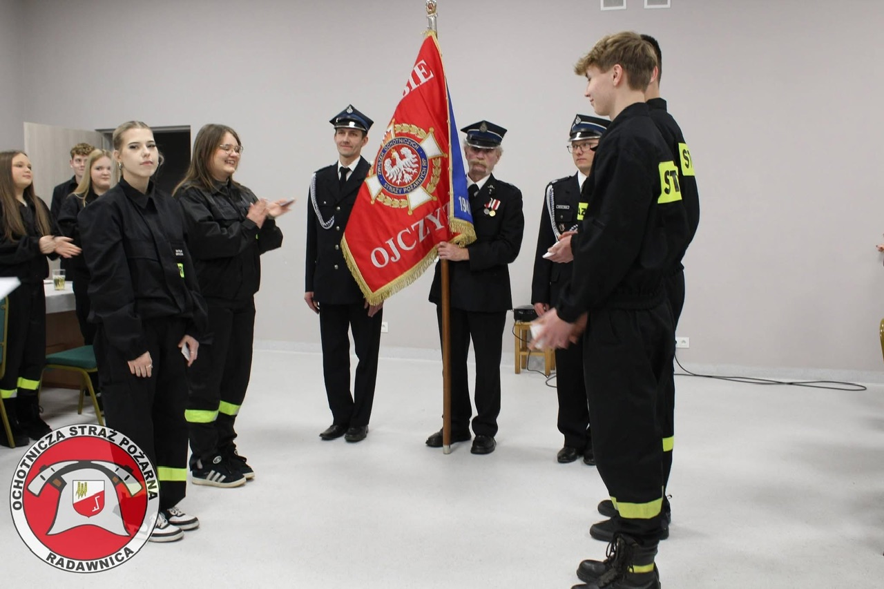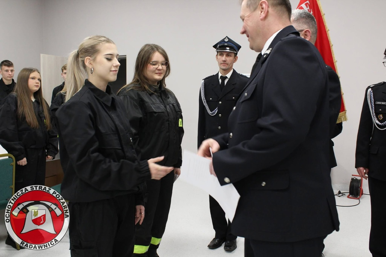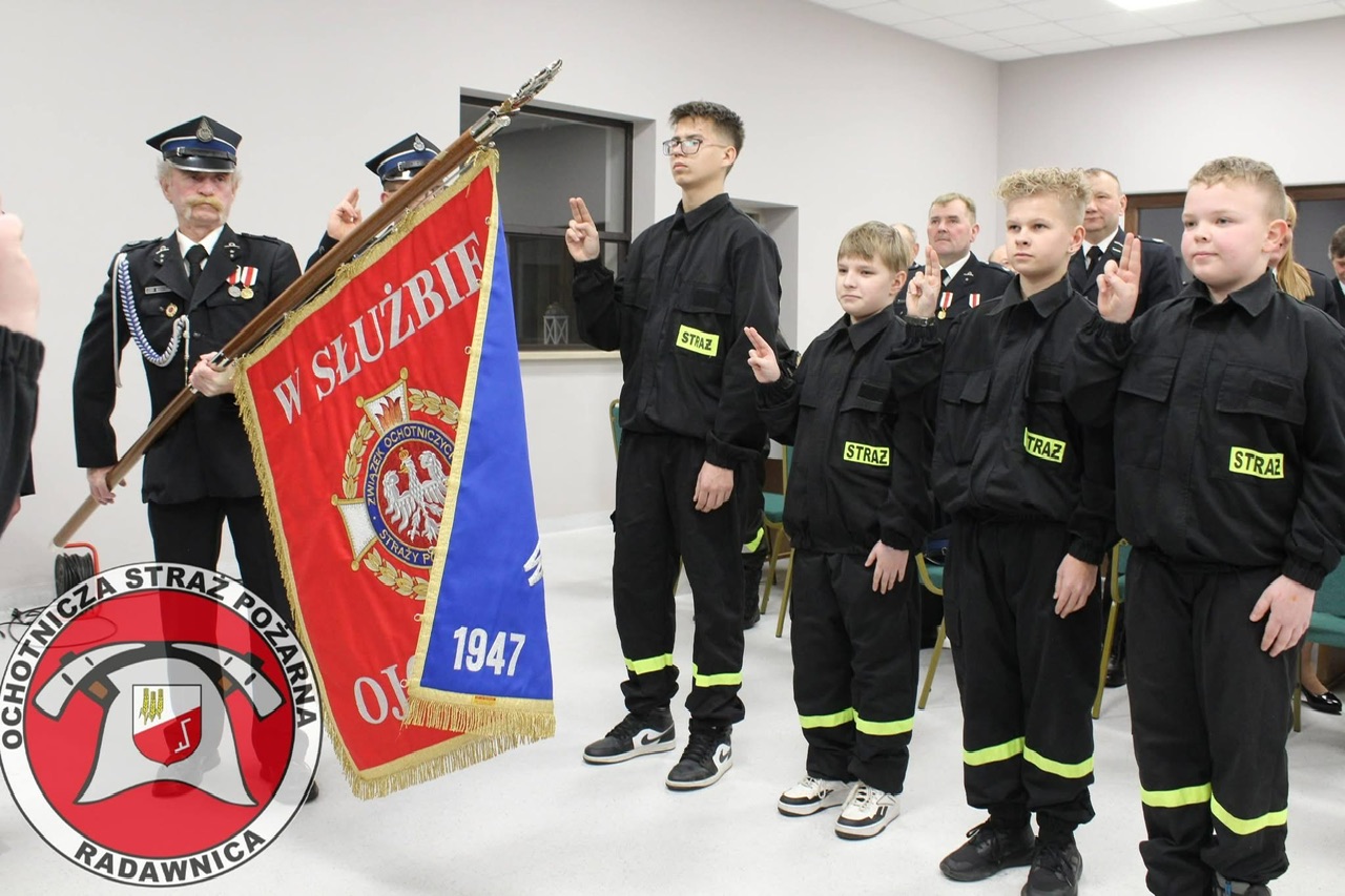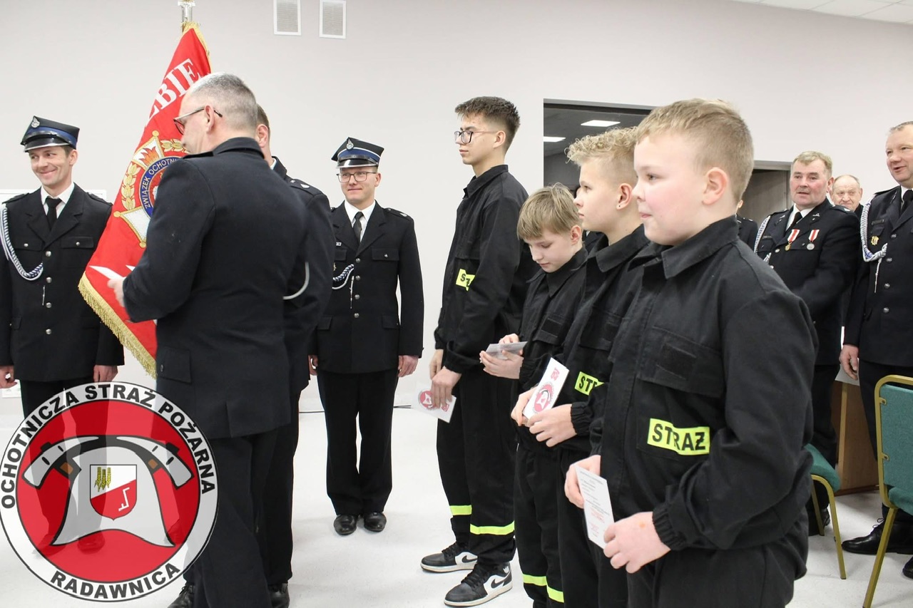 Podczas zebrania szeregi OSP Radawnica oficjalnie wzmocnili młodzi druhowie, którzy z MDP przeszli do służby jako pełnoprawni członkowie: