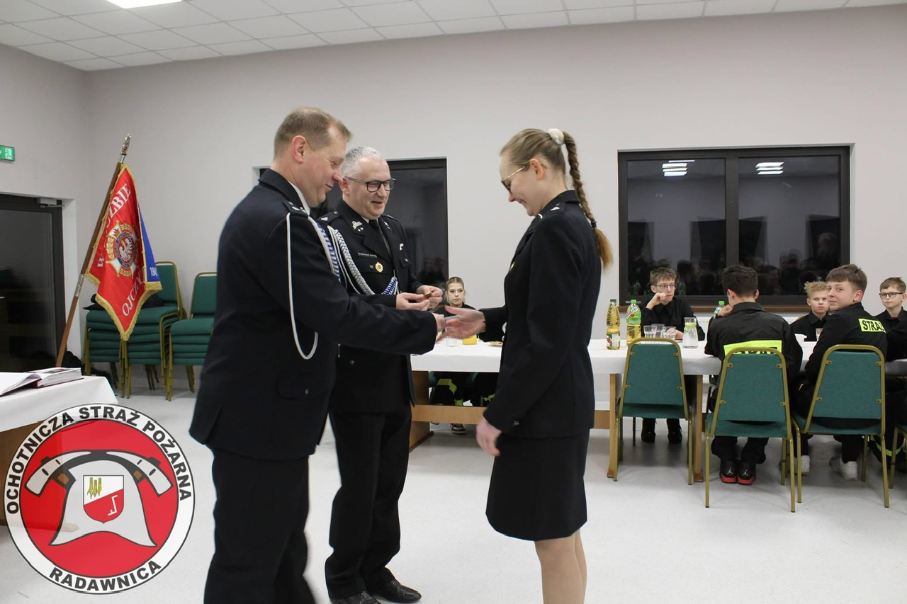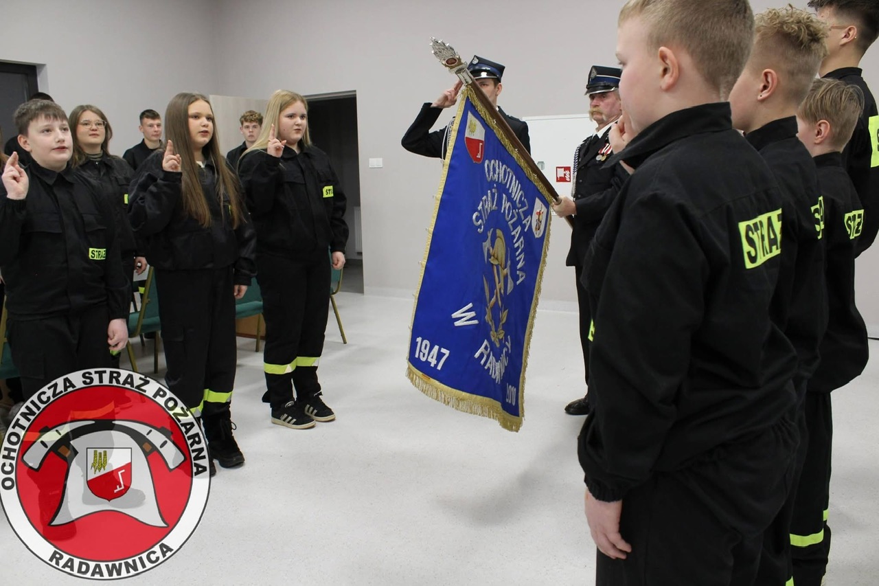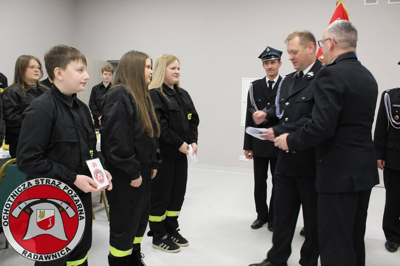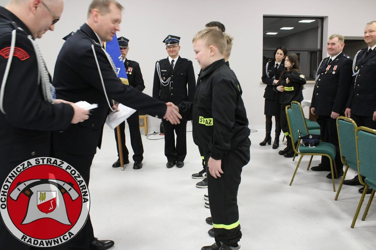 Podczas zebrania szeregi OSP Radawnica oficjalnie wzmocnili młodzi druhowie, którzy z MDP przeszli do służby jako pełnoprawni członkowie: