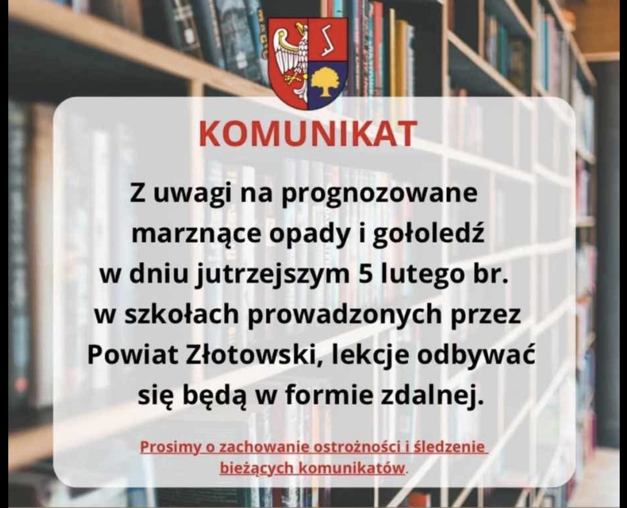 W związku z zapowiadanym marznącym deszczem i groźną gołoledzią wszystkie szkoły średnie w Złotowie w czwartek, 5 lutego, przechodzą na nauczanie zdalne.