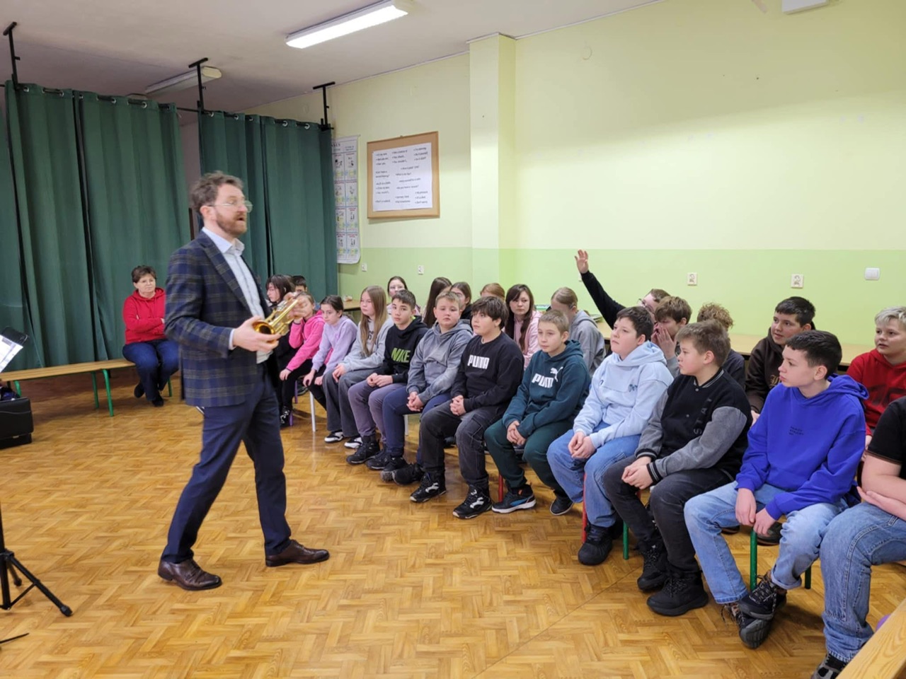 Uczniowie klas czwartych i piątych oraz grupa projektowa mieli okazję uczestniczyć w wyjątkowym spotkaniu z kapelmistrzem Orkiestra Dęta OSP Krajenka – Miłoszem Buchowskim oraz towarzyszącymi mu muzykami.