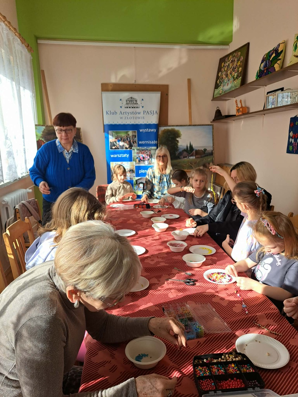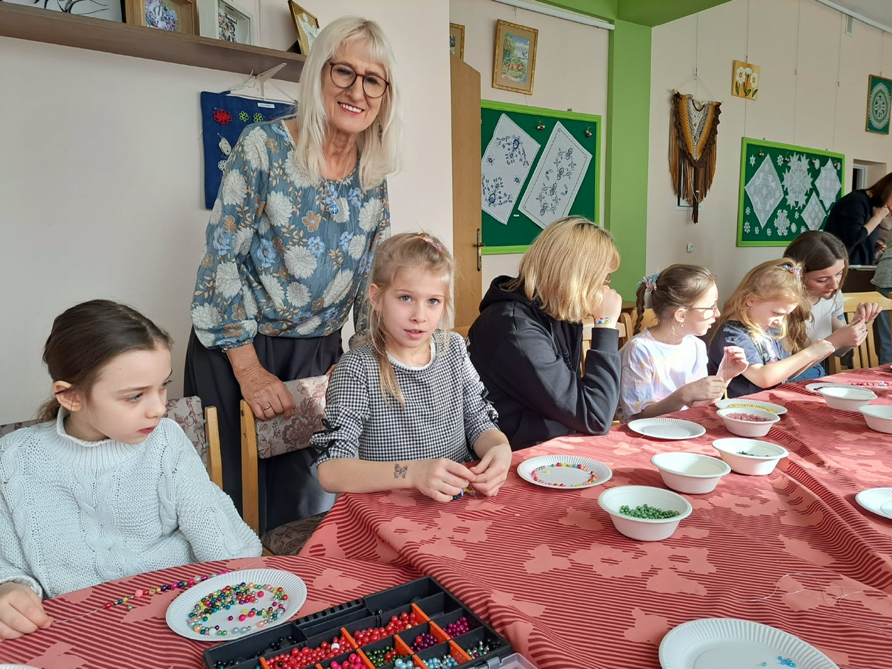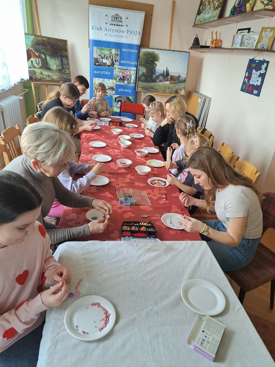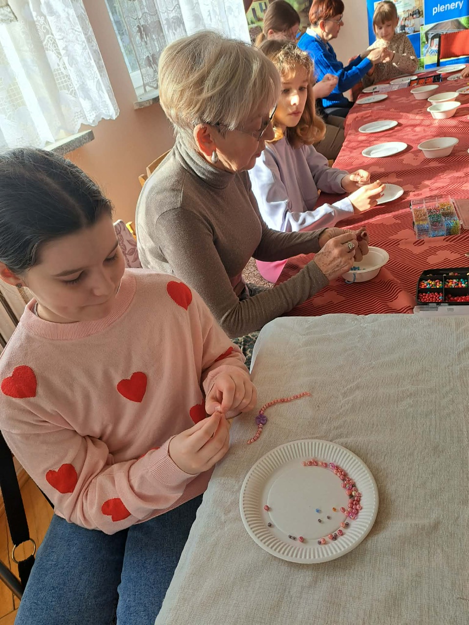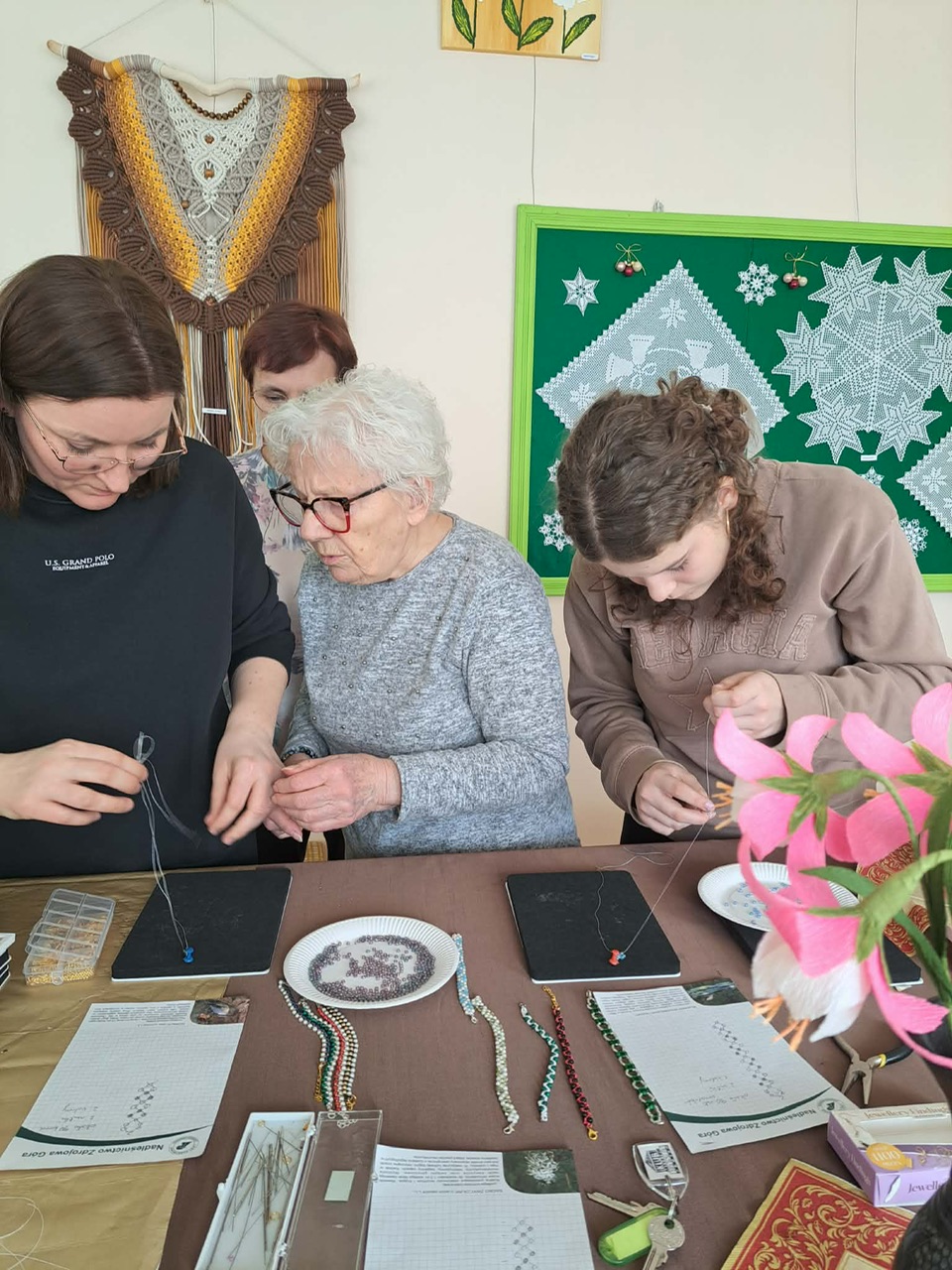 Podczas warsztatów biżuteryjnych powstawały kolorowe bransoletki, naszyjniki, pierścionki i kolczyki. Było kreatywnie, inspirująco i – co najważniejsze – międzypokoleniowo. Zajęcia poprowadziła niezastąpiona Ania Wojciechowska wraz z Pasjonatkami, które z ogromnym zaangażowaniem dzieliły się swoją wiedzą, energią i artystyczną pasją.