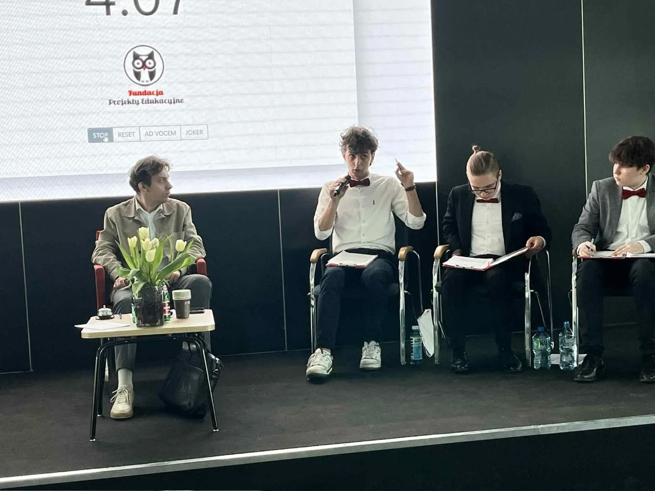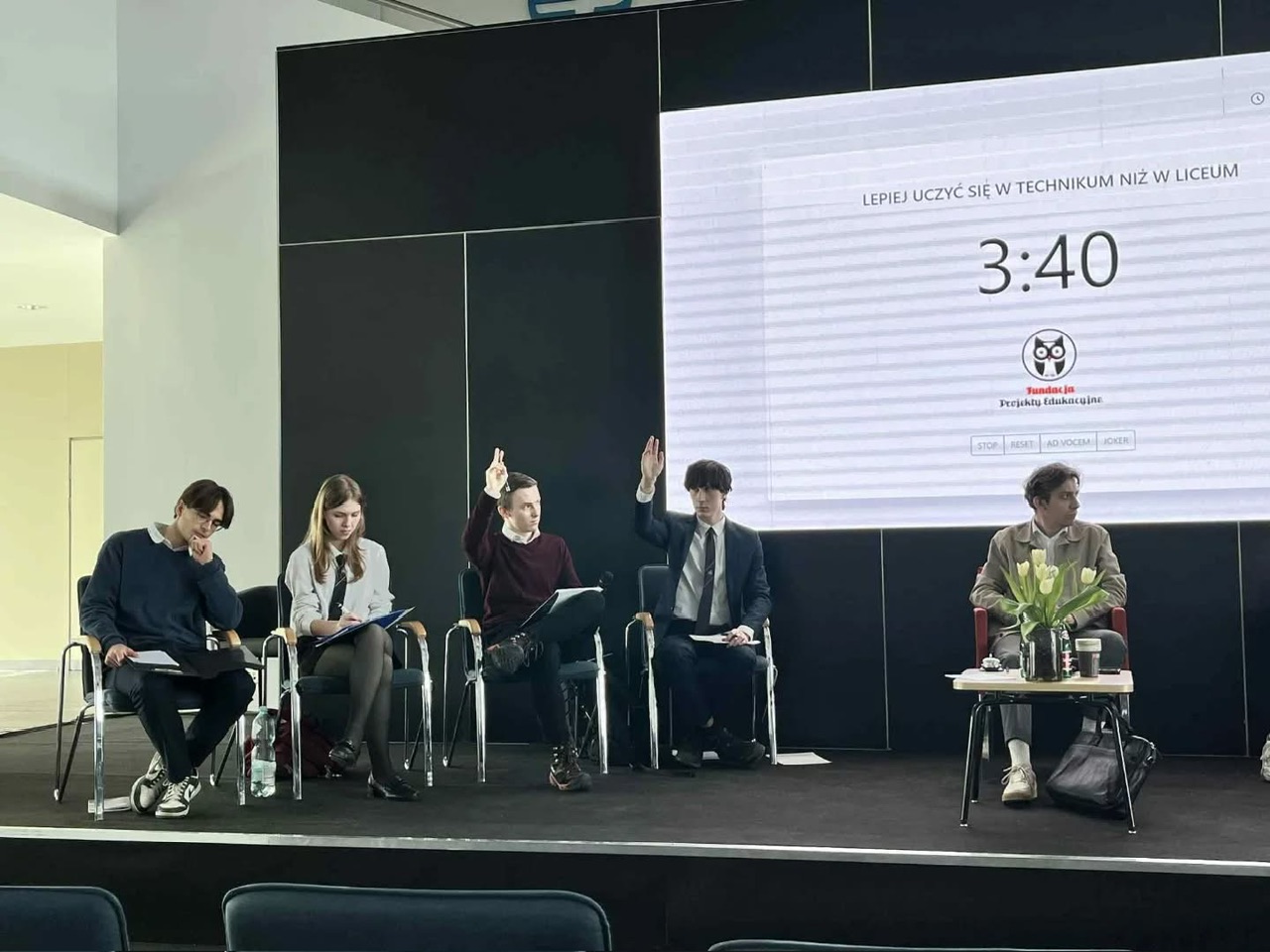 Drużyny zmierzyły się z tezą "Lepiej uczyć się w technikum niż w liceum". Jak łatwo się domyślić, reprezentacja ILO w składzie: Mikołaj Kuśta, Gabriel Rusin, Błażej Stępień i Franciszek Dąbrowski, przekonywała, że to nauka w liceum jest najlepszym wyborem, którego może dokonać młody człowiek, absolwent szkoły podstawowej.