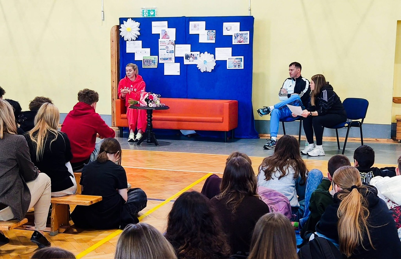Wizyta była nie tylko okazją do wspomnień, ale przede wszystkim inspirującą lekcją dla młodego pokolenia. Uczniowie mieli szansę poznać historię sukcesu osoby, która dzięki determinacji, systematycznej pracy i konsekwencji osiągnęła wysoki poziom sportowy. Opowieść absolwentki pokazała, że nawet ambitne cele są w zasięgu ręki – pod warunkiem wytrwałości i zaangażowania.