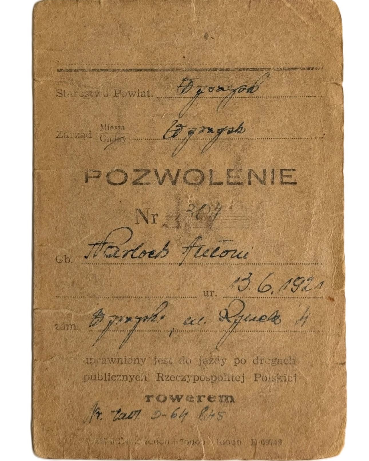 To „Pozwolenie do jazdy rowerem po drogach publicznych Rzeczypospolitej Polskiej”, wystawione na nazwisko Antoniego Narlocha.