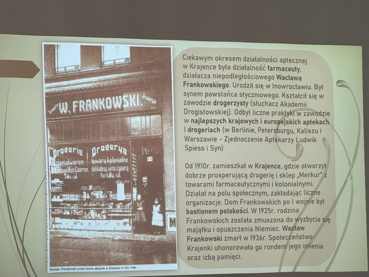 Z kolei dr Paweł Owsianny zwrócił uwagę na rolę roślin leczniczych jako elementu ochrony zdrowia oraz dziedzictwa kulturowego regionu. Konferencję uzupełniło wystąpienie mgr farm. Szymon Jaworski, który przedstawił powojenne dzieje aptekarstwa w Złotowie oraz sylwetki lokalnych aptekarzy.
