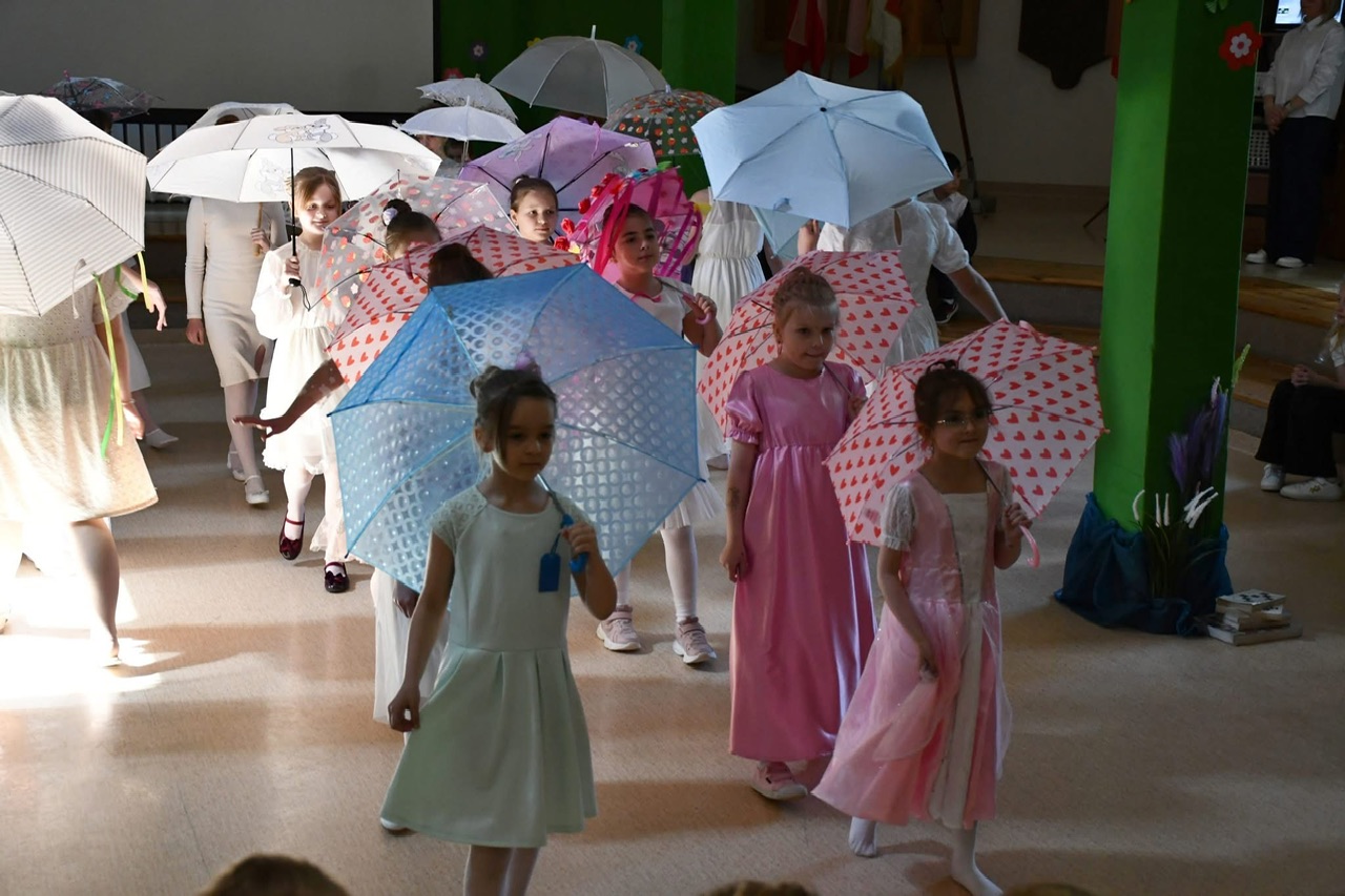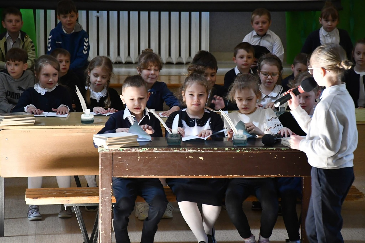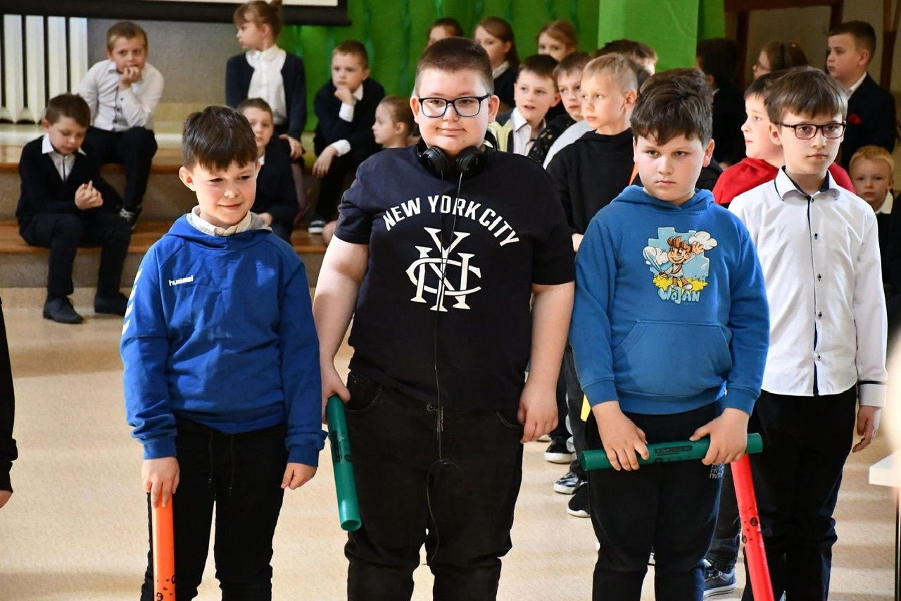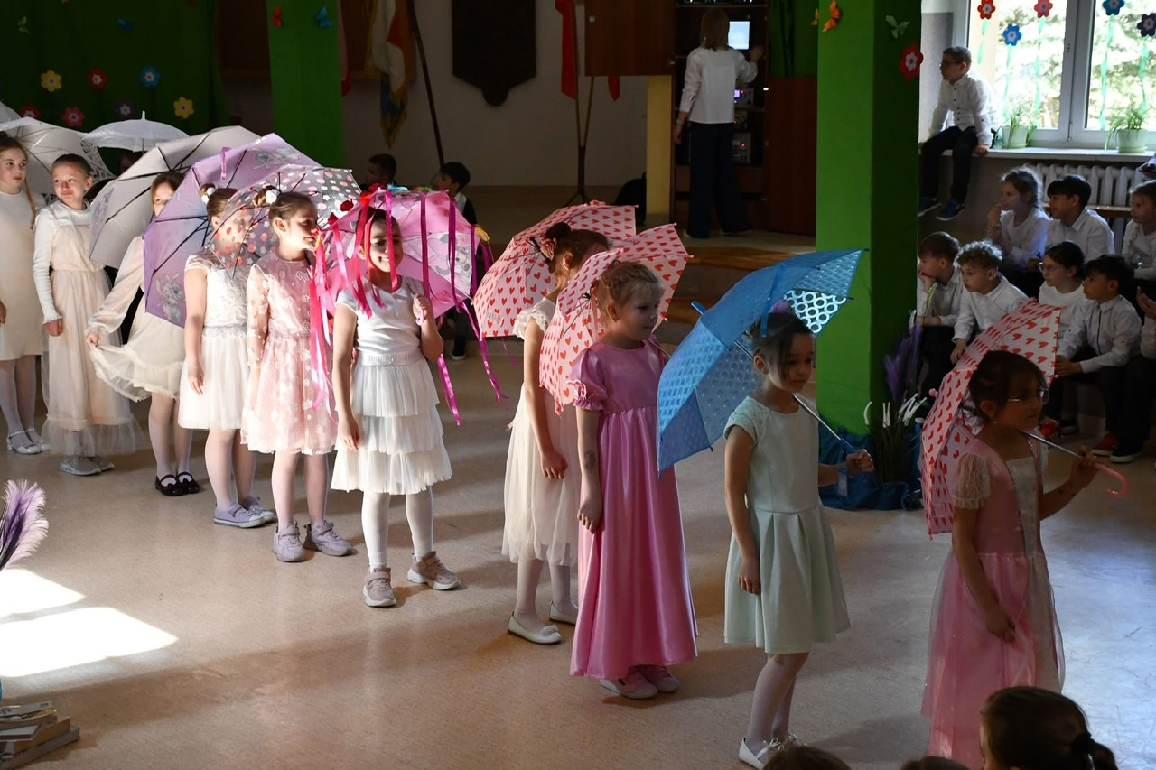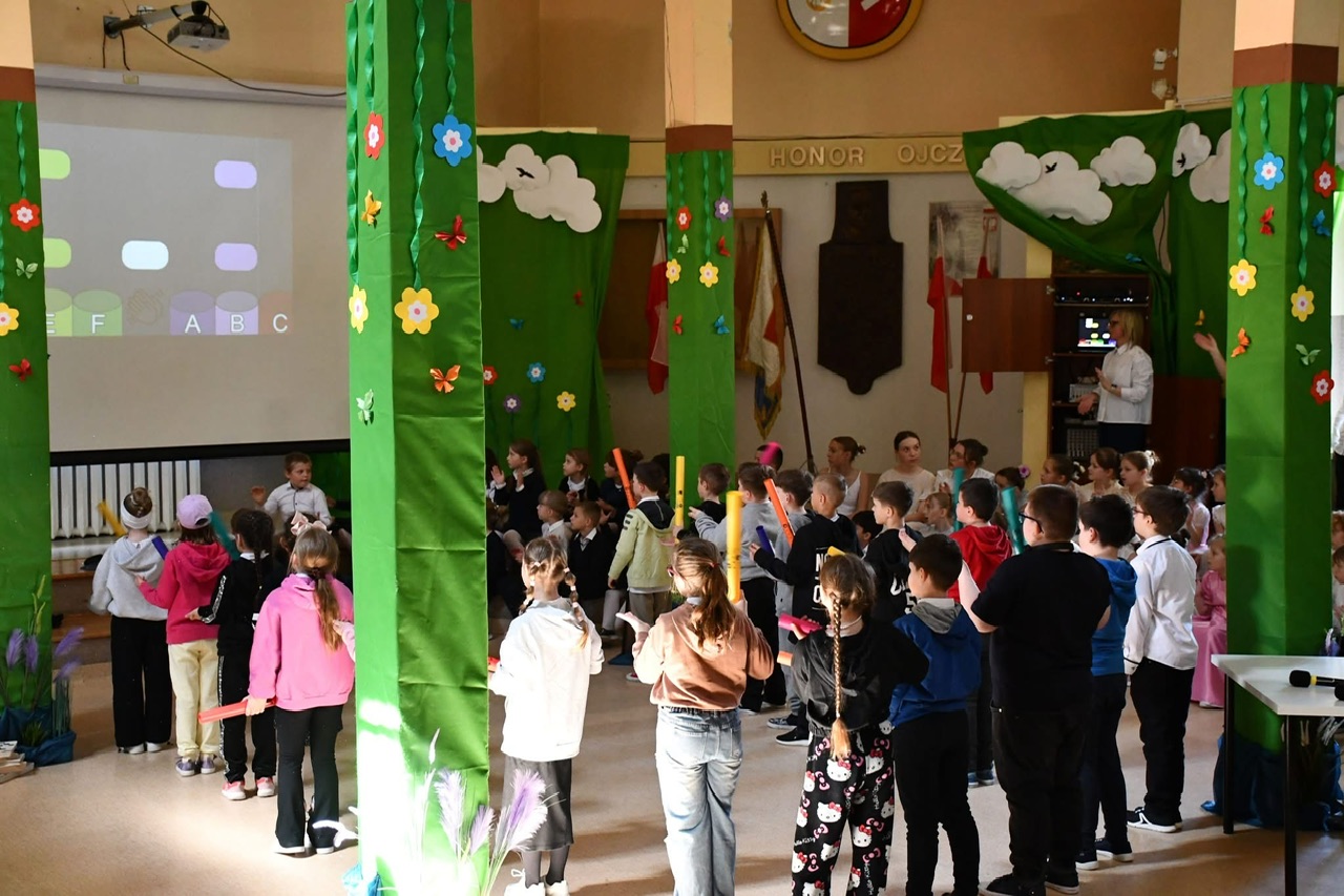 Dalsza część uroczystości przeniosła się do murów szkoły. Tam odbył się uroczysty apel, podczas którego uczniowie zaprezentowali program artystyczny inspirowany klimatem dawnej szkoły. Nie zabrakło efektownych elementów – publiczność z entuzjazmem przyjęła zarówno układ taneczny z parasolkami, jak i występ muzyczny z wykorzystaniem bum-bum rurek.